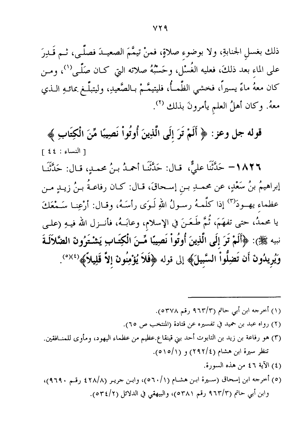 ذَلِكَ بغسل الجنابة، ولا بوضوء صلاة، فمن تيمم الصعيد فصلى، ثم قدر عَلَى الماء بعد ذَلِكَ، فعليه الغسل، وحسبه صلاته، الَّتِي كَانَ صلى، ومن كَانَ معه ماءا يسيرا، فخشي الظمأ، فليتيمم بالصعيد، وليتبلغ بمائه الَّذِي معه وَكَانَ أهل العلم يأمرون بِذَلِكَ "
