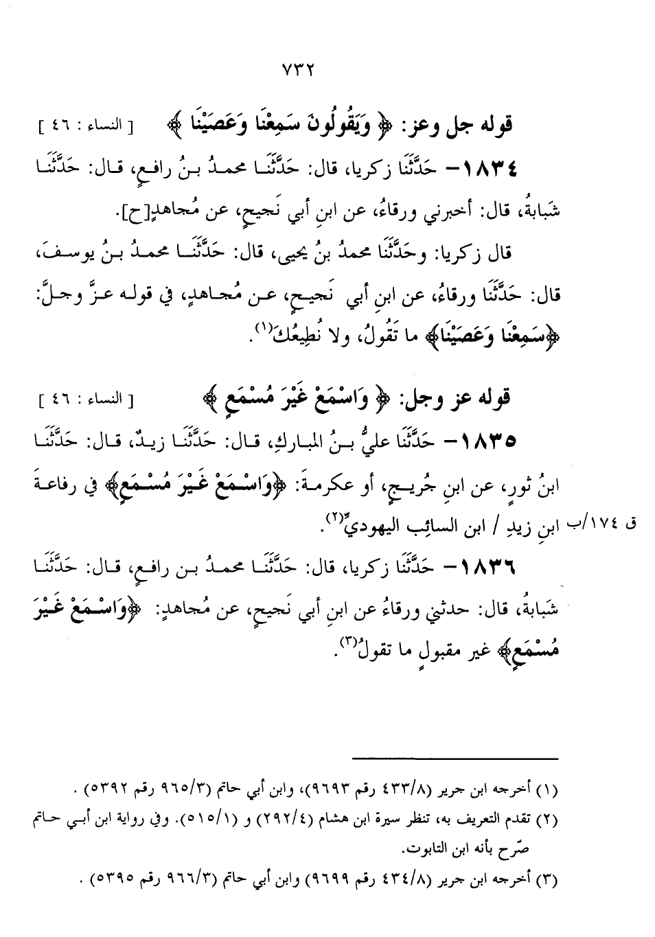 1834 - حَدَّثَنَا زكريا، قَالَ: حَدَّثَنَا مُحَمَّد بْن رافع، قَالَ: حَدَّثَنَا شبابة، قَالَ: أخبرني ورقاء، عَنْ ابْن أبي نجيح، عَنْ مجاهد ح قَالَ زكريا وحدثنا مُحَمَّد بْن يَحْيَى، قَالَ: حَدَّثَنَا مُحَمَّد بْن يوسف، قَالَ: حَدَّثَنَا ورقاء، عَنْ ابْن أبي نجيح، عَنْ مجاهد، فِي قوله عَزَّ وَجَلَّ " {سَمِعْنَا وَعَصَيْنَا} مَا تقول، ولا نطيعك "
