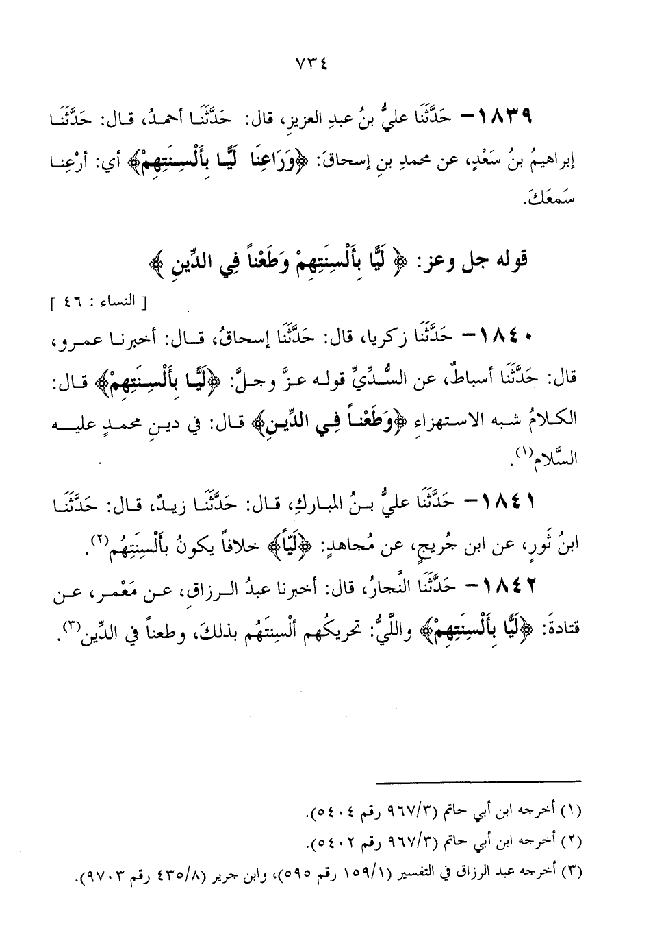1840 - حَدَّثَنَا زكريا، قَالَ: حَدَّثَنَا إِسْحَاق، قَالَ: أَخْبَرَنَا عمرو، قَالَ: حَدَّثَنَا أسباط، عَنْ السدي، قوله عَزَّ وَجَلَّ " {لَيًّا بِأَلْسِنَتِهِمْ} قَالَ: الكلام شبه الاستهزاء {وَطَعْنًا فِي الدِّينِ} ، قَالَ: فِي دين مُحَمَّد عَلَيْهِ السلام "