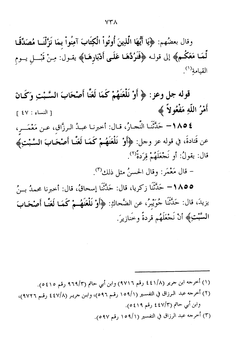 1855 - حَدَّثَنَا زكريا، قَالَ: حَدَّثَنَا إِسْحَاق، قَالَ: أَخْبَرَنَا مُحَمَّد بْن يزيد، قَالَ: حَدَّثَنَا جويبر، عَنْ الضحاك " {أَوْ نَلْعَنَهُمْ كَمَا لَعَنَّا أَصْحَابَ السَّبْتِ} أن نجعلهم قردة وخنازير "