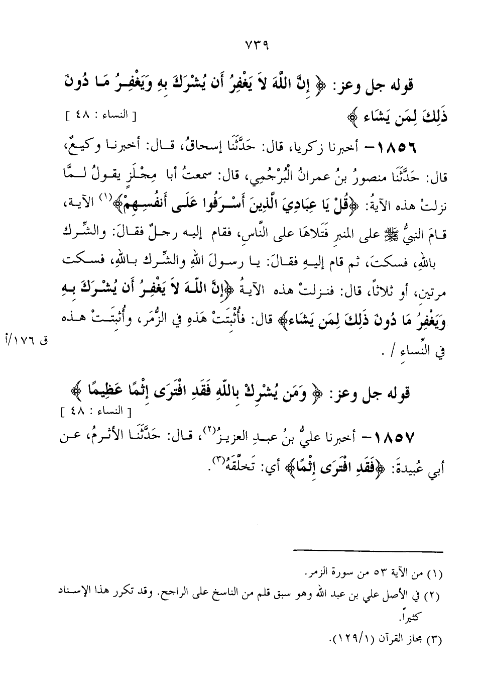 1856 - أَخْبَرَنَا زَكَرِيَّا، قَالَ: حَدَّثَنَا إِسْحَاقُ، قَالَ: أَخْبَرَنَا وَكِيعٌ، قَالَ: حَدَّثَنَا مَنْصُورُ بْنُ عِمْرَانَ الْبُرْجُمِيُّ، قَالَ: سَمِعْتُ أَبَا مِجْلَزٍ، يَقُولُ: لَمَّا نَزَلَتْ هَذِهِ الآيَةُ: {قُلْ يَا عِبَادِيَ الَّذِينَ أَسْرَفُوا عَلَى أَنْفُسِهِمْ} الآية، " قَامَ النَّبِيُّ صَلَّى اللَّهُ عَلَيْهِ وَسَلَّمَ عَلَى الْمِنْبَرِ فَتَلاهَا عَلَى النَّاسِ "، فَقَامَ إِلَيْهِ رَجُلٌ، فَقَالَ: وَالشِّرْكُ بِاللهِ، فَسَكَتَ، ثُمَّ قَامَ إِلَيْهِ، فَقَالَ: يَا رَسُولَ اللهِ، وَالشِّرْكُ بِاللهِ، فَسَكَتَ مَرَّتَيْنِ أَوْ ثَلاثًا، قَالَ: فَنَزَلَتْ هَذِهِ الآيَةُ: {إِنَّ اللهَ لا يَغْفِرُ أَنْ يُشْرَكَ بِهِ وَيَغْفِرُ مَا دُونَ ذَلِكَ لِمَنْ يَشَاءُ} قَالَ: فَأُثْبِتَتْ هَذِهِ فِي الزُّمَرِ، وأُثْبِتَتْ هَذِهِ فِي النِّسَاءِ "