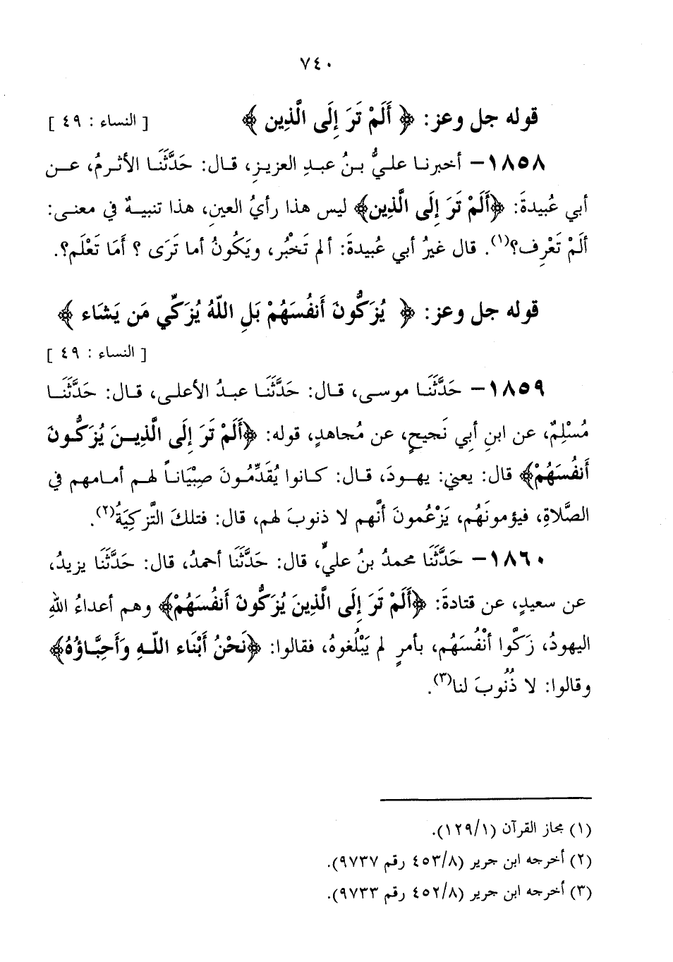 1859 - حَدَّثَنَا مُوسَى، قَالَ: حَدَّثَنَا عَبْد الأعلى، قَالَ: حَدَّثَنَا مسلم، عَنْ ابْن أبي نجيح، عَنْ مجاهد، قوله " {أَلَمْ تَرَ إِلَى الَّذِينَ يُزَكُّونَ أَنْفُسَهُمْ} ، قَالَ: يعني: يهود، قَالَ: كَانُوا يقدمون صبيانا لهم أمامهم فِي الصلاة، فيؤمونهم، يزعمون أنهم لا ذنوب لهم، قَالَ: فتلك التزكية "