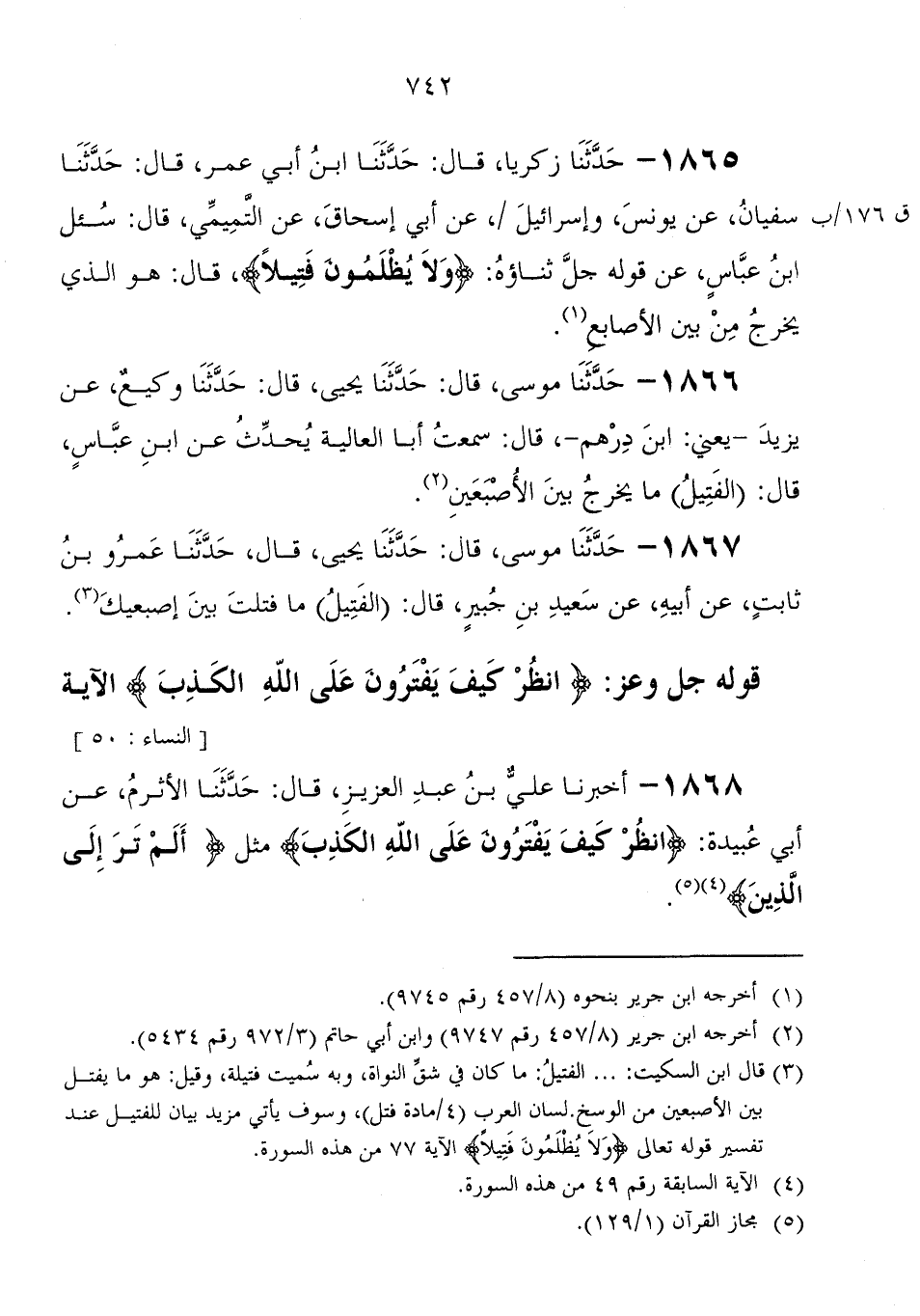 1865 - حَدَّثَنَا زَكَرِيَّا، قَالَ: حَدَّثَنَا ابْنُ أَبِي عُمَرَ، قَالَ: حَدَّثَنَا سُفْيَانُ، عَنْ يُونُسَ، وَإِسْرَائِيلَ، عَنْ أَبِي إِسْحَاقَ، عَنِ التَّمِيمِيِّ، قَالَ: سُئِلَ ابْنُ عَبَّاسٍ عَنْ قوله جَلَّ ثَنَاؤُهُ " {وَلا يُظْلَمُونَ فَتِيلا} ، قَالَ: هُوَ الَّذِي يَخْرُجُ مِنْ بَيْنِ الأَصَابِعِ "