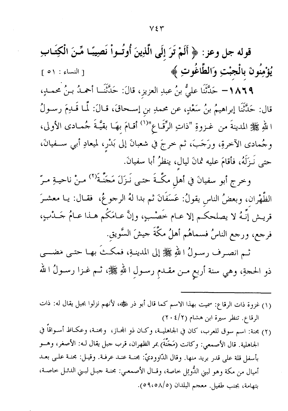 1869 - حَدَّثَنَا عَلِيُّ بْنُ عَبْدِ الْعَزِيزِ، قَالَ: حَدَّثَنَا أَحْمَدُ بْنُ مُحَمَّدٍ، قَالَ: حَدَّثَنَا إِبْرَاهِيمُ بْنُ سَعْدٍ، عَنْ مُحَمَّدِ بْنِ إِسْحَاقَ، قَالَ: " لَمَّا قَدِمَ رَسُولُ اللهِ صَلَّى اللَّهُ عَلَيْهِ وَسَلَّمَ الْمَدِينَةَ مِنْ غَزْوَةِ ذَاتِ الرِّقَاعِ، أَقَامَ بِهَا بَقِيَّةَ جُمَادَى الأُولَى، وَجُمَادَى الآخِرَةَ، وَرَجَبَ، ثُمَّ خَرَجَ فِي شَعْبَانَ إِلَى بَدْرٍ لِمِيعَادِ أَبِي سُفْيَانَ، حَتَّى نَزَلَهُ، فَأَقَامَ عَلَيْهِ ثَمَانِ لَيَالٍ، يَنْظُرُ أَبَا سُفْيَانَ وَخَرَجَ أَبُو سُفْيَانَ فِي أَهْلِ مَكَّةَ حَتَّى نَزَلَ مَجَنَّةَ، مِنْ نَاحِيَةِ مَرِّ الظَّهْرَانِ، وَبَعْضُ النَّاسِ يَقُولُ: عَسْفَانَ ثُمَّ بَدَا لَهُ الرُّجُوعُ، فَقَالَ: يَا مَعْشَرَ قُرَيْشٍ، إِنَّهُ لا يُصْلِحُكُمْ إِلا عَامُ خِصْبٍ، وَإِنَّ عَامَكُمْ هَذَا عَامُ جَدْبٍ، فَرَجَعَ وَرَجَعَ النَّاسُ فَسَمَّاهُمْ أَهْلُ مَكَّةَ جَيْشَ السُّوَيْقِ ثُمَّ انْصَرَفَ رَسُولُ اللهِ صَلَّى اللَّهُ عَلَيْهِ وَسَلَّمَ إِلَى الْمَدِينَةِ، فَمَكَثَ بِهَا حَتَّى مَضَى ذُو الْحَجَّةِ، وَهِيَ سَنَةُ أَرْبَعٍ مِنْ مَقْدَمِ رَسُولِ اللهِ صَلَّى اللَّهُ عَلَيْهِ وَسَلَّمَ، ثُمَّ غَزَا رَسُولُ اللهِ