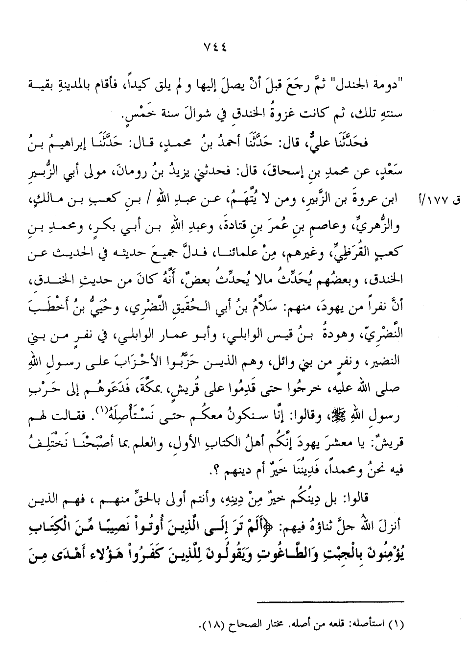 دُومَةَ الْجَنْدَلِ، ثُمَّ رَجَعَ قَبْلَ أَنْ يَصِلَ إِلَيْهَا، وَلَمْ يَلْقَ كَيْدًا، فَأَقَامَ بِالْمَدِينَةِ بَقِيَّةَ سَنَتِهِ تِلْكَ، ثُمَّ كَانَتْ غَزْوَةُ الْخَنْدَقِ فِي شَوَّالٍ سَنَةَ خَمْسٍ " فَحَدَّثَنَا عَلَيٌّ، قَالَ: حَدَّثَنَا أَحْمَدُ بْنُُ مُحَمَّدٍ، قَالَ: حَدَّثَنَا إِبْرَاهِيمُ بْنُ سَعْدٍ، عَنْ مُحَمَّدِ بْنِ إِسْحَاقَ، قَالَ: فَحَدَّثَنِي يَزِيدُ بْنُ رُومَانَ مَوْلَى أَبِي الزُّبَيْرِ بْنِ عُرْوَةَ، وَمَنْ لا يُتَّهَمُ، عَنْ عَبْدِ اللهِ بْنِ كَعْبِ بْنِ مَالِكٍ، وَالزُّهْرُيِّ، وَعَاصِمِ بْنِ عُمَرَ بْنِ قَتَادَةَ، وَعَبْدِ اللهِ بْنِ أَبِي بَكْرٍ، وَمُحَمَّدِ بْنِ كَعْبٍ الْقُرَظِيِّ، وَغَيْرِهِمْ مِنْ عُلَمَائِنَا، فدل جميع حديثه فِي الحديث عَنْ الخندق، وبعضهم حدث مَا لا يحدث بعض، أنه كَانَ من حديث الخندق، أن نفرا من يهود منهم: سلام بْن أبي الحقيق النضري، وحيي بْن أخطب النضري، وهودة بْن قيس الوابلي، وَأَبُو عمار الوابلي، فِي نفر من بني النضير، ونفر من بني وائل، وهم الَّذِينَ حزبوا الأحزاب عَلَى رَسُول اللهِ صَلَّى اللَّهُ عَلَيْهِ وَسَلَّمَ، خرجوا حَتَّى قدموا عَلَى قريش بمكة، فدعوهم إِلَى حرب رَسُول اللهِ صَلَّى اللَّهُ عَلَيْهِ وَسَلَّمَ، وقالوا: إنا سنكون معكم حَتَّى نستأصله، فقالت لهم قريش: يَا معشر يهود إنكم أهل الكتاب الأول، والعلم بما أصبحنا نختلف فيه نحن ومُحَمَّدا فديننا خير أم دينهم؟ قَالُوا: بل دينكم خير من دينه، وأنتم أولى بالحق منهم، فهم الَّذِينَ أنزل الله جل ثناؤه فيهم: {أَلَمْ تَرَ إِلَى الَّذِينَ أُوتُوا نَصِيبًا مِنَ الْكِتَابِ يُؤْمِنُونَ بِالْجِبْتِ وَالطَّاغُوتِ وَيَقُولُونَ لِلَّذِينَ كَفَرُوا هَؤُلاءِ أَهْدَى مِنَ