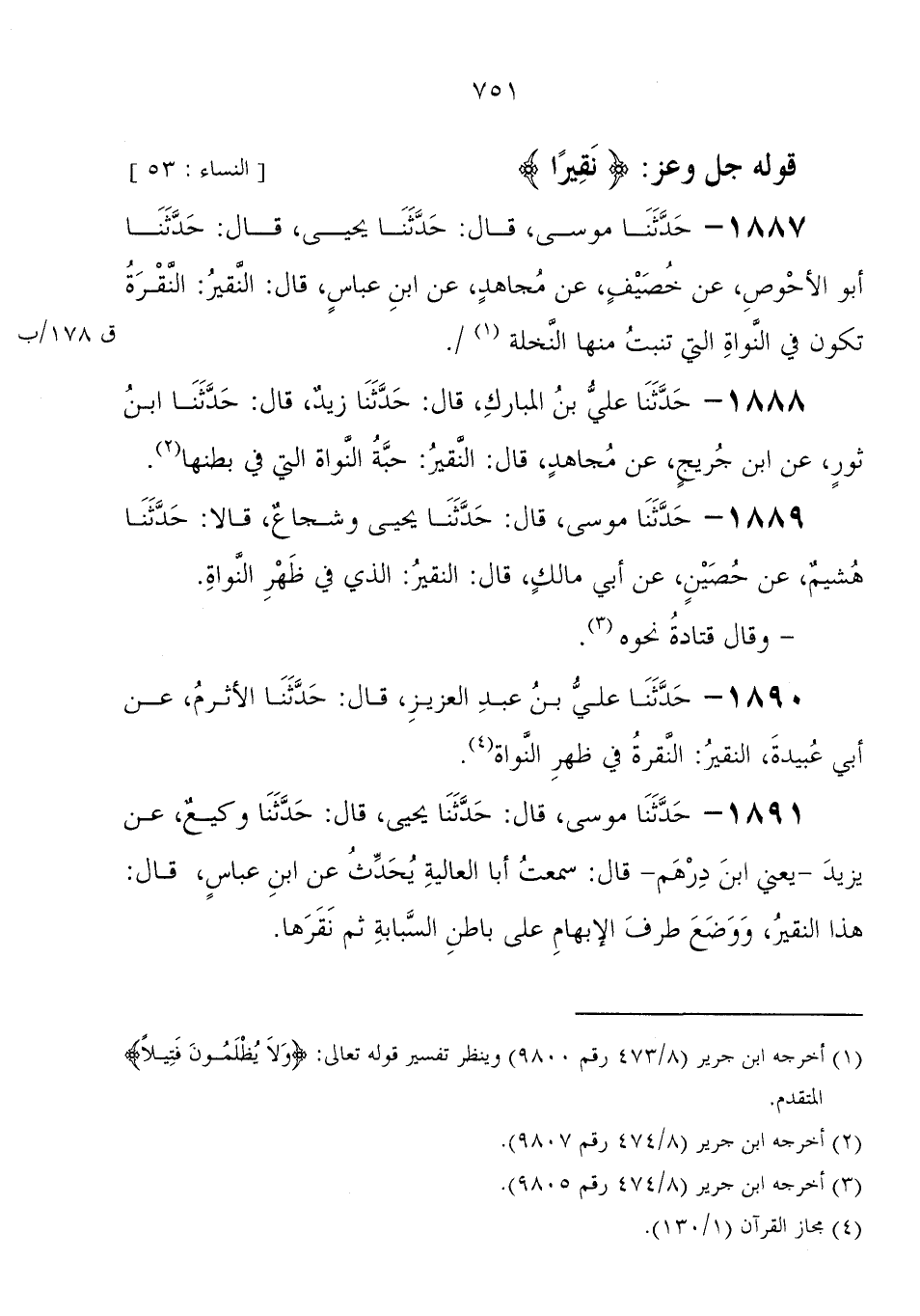 1889 - حَدَّثَنَا مُوسَى، قَالَ: حَدَّثَنَا يَحْيَى، وَشُجَاعٌ، قَالا: حَدَّثَنَا هُشَيْمٌ، عَنْ حُصَيْنٍ، عَنْ أَبِي مَالِكٍ، قَالَ: " النَّقِيرُ: الَّذِي فِي ظَهْرِ النَّوَاةِ "