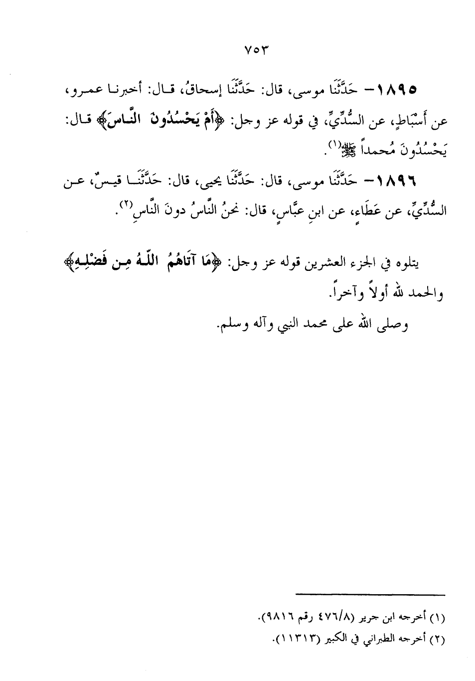1895 - حَدَّثَنَا مُوسَى، قَالَ: حَدَّثَنَا إِسْحَاق، قَالَ: أَخْبَرَنَا عمرو، عَنْ أسباط، عَنْ السدي، فِي قوله عَزَّ وَجَلَّ " {أَمْ يَحْسُدُونَ النَّاسَ} قَالَ: يحسدون مُحَمَّدا صَلَّى اللَّهُ عَلَيْهِ وَسَلَّمَ "