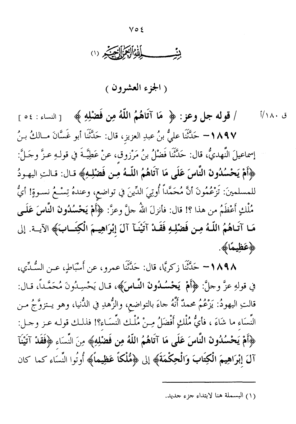 1897 - حَدَّثَنَا عَلِيُّ بْنُ عَبْدِ الْعَزِيزِ، قَالَ: حَدَّثَنَا أَبُو غَسَّان مالك بْن إسماعيل النهدي، قَالَ: حَدَّثَنَا فضل بْن مرزوق، عَنْ عطية، فِي قوله عَزَّ وَجَلَّ " {أَمْ يَحْسُدُونَ النَّاسَ عَلَى مَا آتَاهُمُ اللهُ مِنْ فَضْلِهِ} قَالَ: قالت اليهود للمسلمين: تزعمون أن مُحَمَّدا أوتي الدين فِي تواضع، وعنده تسع نسوة، أي: ملك أعظم من هَذَا؟ قَالَ: فأنزل الله جَلَّ وَعَزَّ: {أَمْ يَحْسُدُونَ النَّاسَ عَلَى مَا آتَاهُمُ اللهُ مِنْ فَضْلِهِ فَقَدْ آتَيْنَا آلَ إِبْرَاهِيمَ الْكِتَابَ الآية إِلَى عَظِيمًا} "