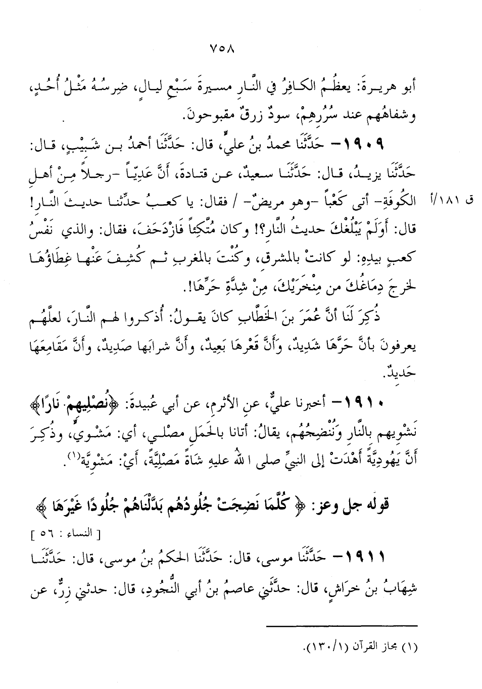1909 - حَدَّثَنَا مُحَمَّدُ بْنُ عَلِيٍّ، قَالَ: حَدَّثَنَا أَحْمَدُ بْنُ شَبِيبٍ، قَالَ: حَدَّثَنَا يَزِيدُ، قَالَ: حَدَّثَنَا سَعِيدٌ، عَنْ قَتَادَةَ، " أَنَّ عَدِيًّا، رَجُلا مِنْ أَهْلِ الْكُوفَةِ، أَتَى كَعْبًا، وَهُوَ مَرِيضٌ، فَقَالَ: يَا كَعْبُ، حَدِّثْنَا حَدِيثَ النَّارِ، قَالَ: أَوَلَمْ يَبْلُغْكَ حَدِيثَ النَّارِ؟ وَكَانَ مُتَّكِئًا فَازْدَحَفَ، فَقَالَ: وَالَّذِي نَفْسُ كَعْبٍ بِيَدِهِ، لَوْ كَانَتْ بِالْمَشْرِقِ، وَكُنْتَ بِالْمَغْرِبِ ثُمَّ كُشِفَ عَنْهَا غِطَاؤُهَا، لَخَرَجَ دِمَاغُكَ مِنْ مِنْخَرَيْكَ مِنْ شِدَّةِ حَرِّهَا ذُكِرَ لَنَا أَنَّ عُمَرَ بْنَ الْخَطَّابِ، كَانَ يَقُول: " اذْكُرُوا لَهُمُ النَّارَ، لَعَلَّهُمْ يَعْرِفُونَ بِأَنَّ حَرَّهَا شَدِيدٌ، وَأَنَّ قَعْرَهَا بَعِيدٌ، وَأَنَّ شَرَابَهَا صَدِيدٌ، وَأَنَّ مَقَامِعَهَا حَدِيدٌ "