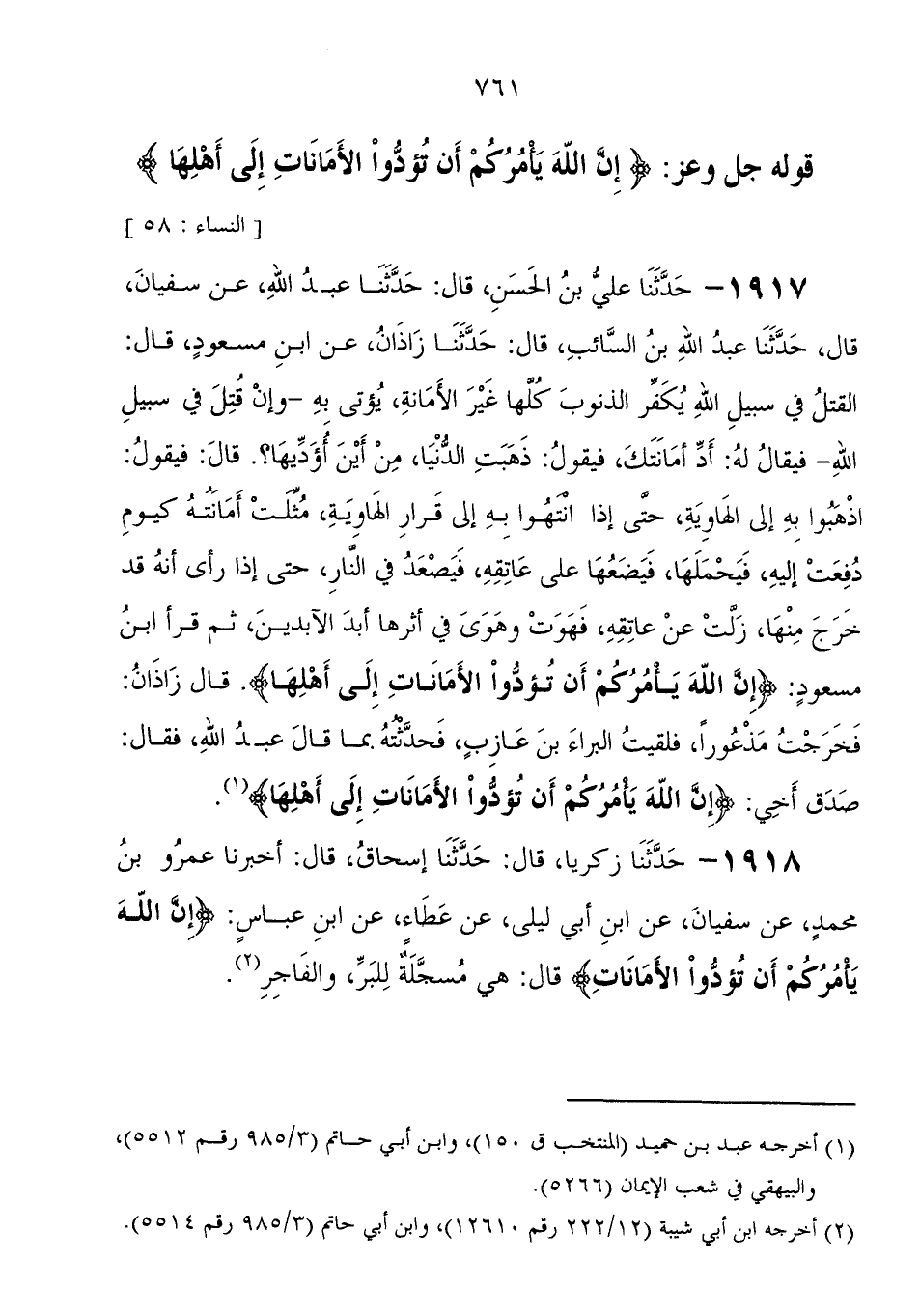 1917 - حَدَّثَنَا عَلِيُّ بْنُ الْحَسَنِ، قَالَ: حَدَّثَنَا عَبْدُ اللهِ، عَنْ سُفْيَانَ، قَالَ: حَدَّثَنَا عَبْدُ اللهِ بْنُ السَّائِبِ، قَالَ: حَدَّثَنَا زَاذَانُ، عَنِ ابْنِ مَسْعُودٍ، قَالَ: " الْقَتْلُ فِي سَبِيلِ اللهِ يُكَفِّرُ الذُّنُوبَ كُلَّهَا غَيْرَ الأَمَانَةِ، يُؤْتَى بِهِ، وَإِنْ قُتِلَ فِي سَبِيلِ اللهِ، فَيُقَالُ لَهُ: أَدِّ أَمَانَتَكَ، فَيَقُولُ: ذَهَبَتِ الدُّنْيَا، مِنْ أَيْنَ أُؤَدِّيهَا؟ قَالَ: فَيَقُولُ: اذْهَبُوا بِهِ إِلَى الْهَاوِيَةِ، حَتَّى إِذَا انْتَهَوْا بِهِ إِلَى قَرَارِ الْهَاوِيَةِ، مَثُلَتْ أَمَانَتُهُ كَيَوْمِ دُفِعَتْ إِلَيْهِ، فَيَحْمِلُهَا، فَيَضَعُهَا عَلَى عَاتِقِهِ، فَيَصْعَدُ فِي النَّارِ، حَتَّى رَأَى أَنَّهُ قَدْ خَرَجَ مِنْهَا، زَلَّتْ عَنْ عَاتِقِهِ، فَهَوَتْ وَهَوَى فِي أَثَرِهَا أَبَدَ الآبِدِينَ، ثُمَّ قَرَأَ ابْنُ مَسْعُودٍ: {إِنَّ اللهَ يَأْمُرُكُمْ أَنْ تُؤَدُّوا الأَمَانَاتِ إِلَى أَهْلِهَا} قَالَ زَاذَانُ: فَخَرَجْتُ مَذْعُورًا، فَلَقِيتُ الْبَرَاءَ بْنَ عَازِبٍ، فَحَدَّثْتُهُ بِمَا قَالَ عَبْدُ اللهِ بْنُ مَسْعُودٍ، فَقَالَ: صَدَقَ أَخِي: {إِنَّ اللهَ يَأْمُرُكُمْ أَنْ تُؤَدُّوا الأَمَانَاتِ إِلَى أَهْلِهَا} "