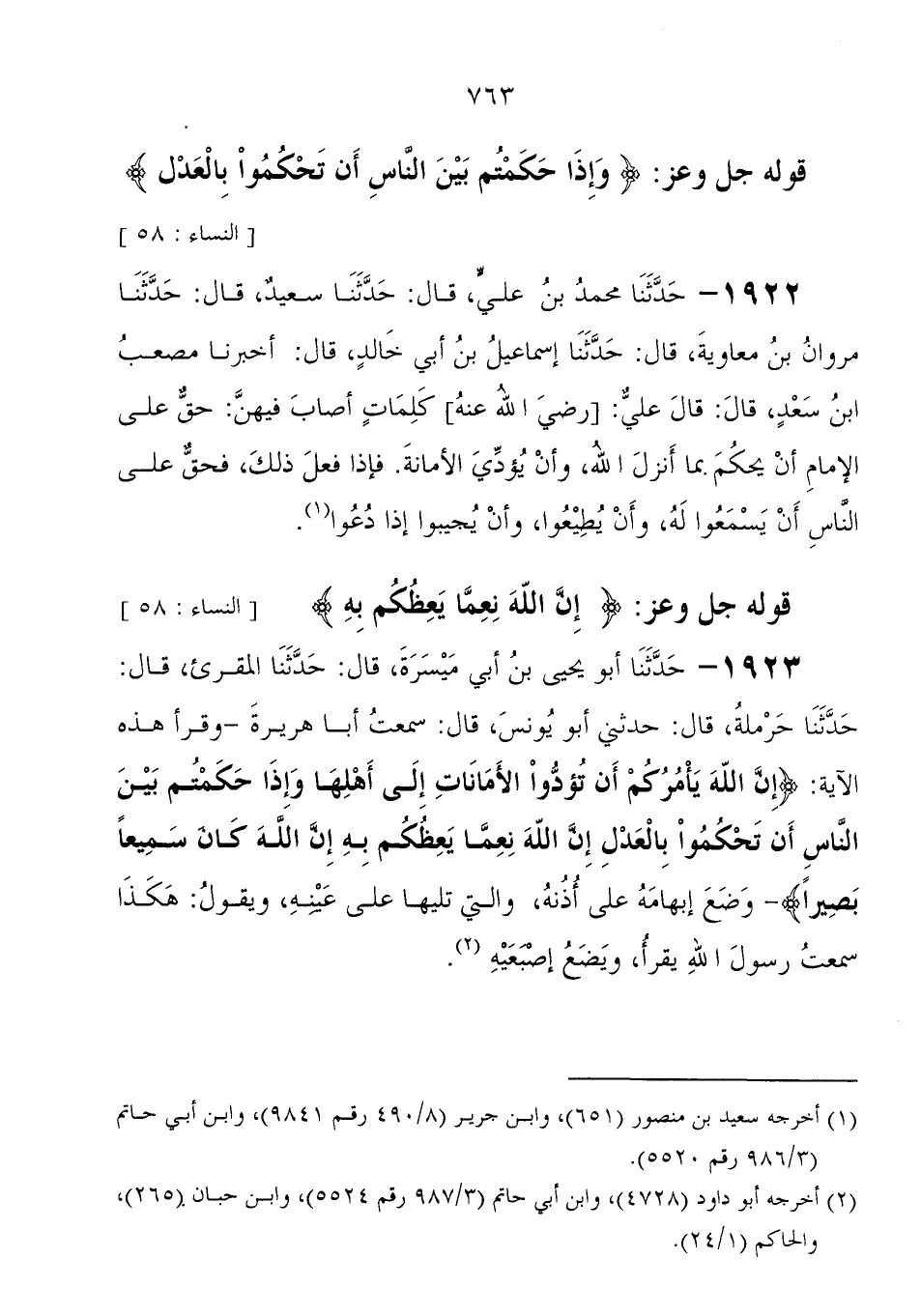 1923 - حَدَّثَنَا أَبُو يَحْيَى بْنُ أَبِي مَيْسَرَةَ، قَالَ: حَدَّثَنَا الْمُقْرِئُ، قَالَ: حَدَّثَنَا حَرْمَلَةُ، قَالَ: حَدَّثَنِي أَبُو يُونُسَ، قَالَ " سَمِعْتُ أَبَا هُرَيْرَةَ، وَقَرَأَ هَذِهِ الآيَةَ: {إِنَّ اللهَ يَأْمُرُكُمْ أَنْ تُؤَدُّوا الأَمَانَاتِ إِلَى أَهْلِهَا وَإِذَا حَكَمْتُمْ بَيْنَ النَّاسِ أَنْ تَحْكُمُوا بِالْعَدْلِ إِنَّ اللهَ نِعِمَّا يَعِظُكُمْ بِهِ إِنَّ اللهَ كَانَ سَمِيعًا بَصِيرًا} ، وَضَعَ إِبْهَامَهُ عَلَى أُذُنِهِ، وَالَّتِي تَلِيهَا عَلَى عَيْنِهِ، وَيَقُولُ: هَكَذَا سَمِعْتُ رَسُولَ اللهِ يَقْرَأُ، وَيَضَعُ إِصْبَعَيْهِ "