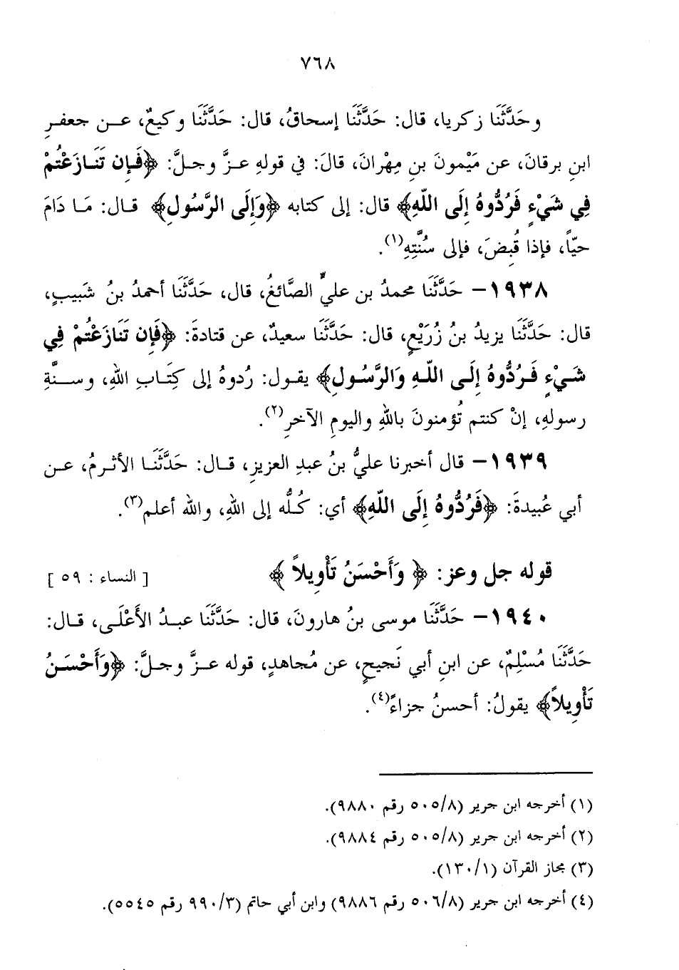 1938 - حَدَّثَنَا مُحَمَّدُ بْنُ عَلِيٍّ الصَّائِغُ، قَالَ: حَدَّثَنَا أَحْمَدُ بْنُ شبيب، قَالَ: حَدَّثَنَا يزيد بْن زريع، قَالَ: حَدَّثَنَا سعيد، عَنْ قتادة، " {فَإِنْ تَنَازَعْتُمْ فِي شَيْءٍ فَرُدُّوهُ إِلَى اللهِ وَالرَّسُولِ} ، يَقُول: ردوه إِلَى كتاب الله، وسنة رسوله، إن كنتم تؤمنون بِاللهِ واليوم الآخر "