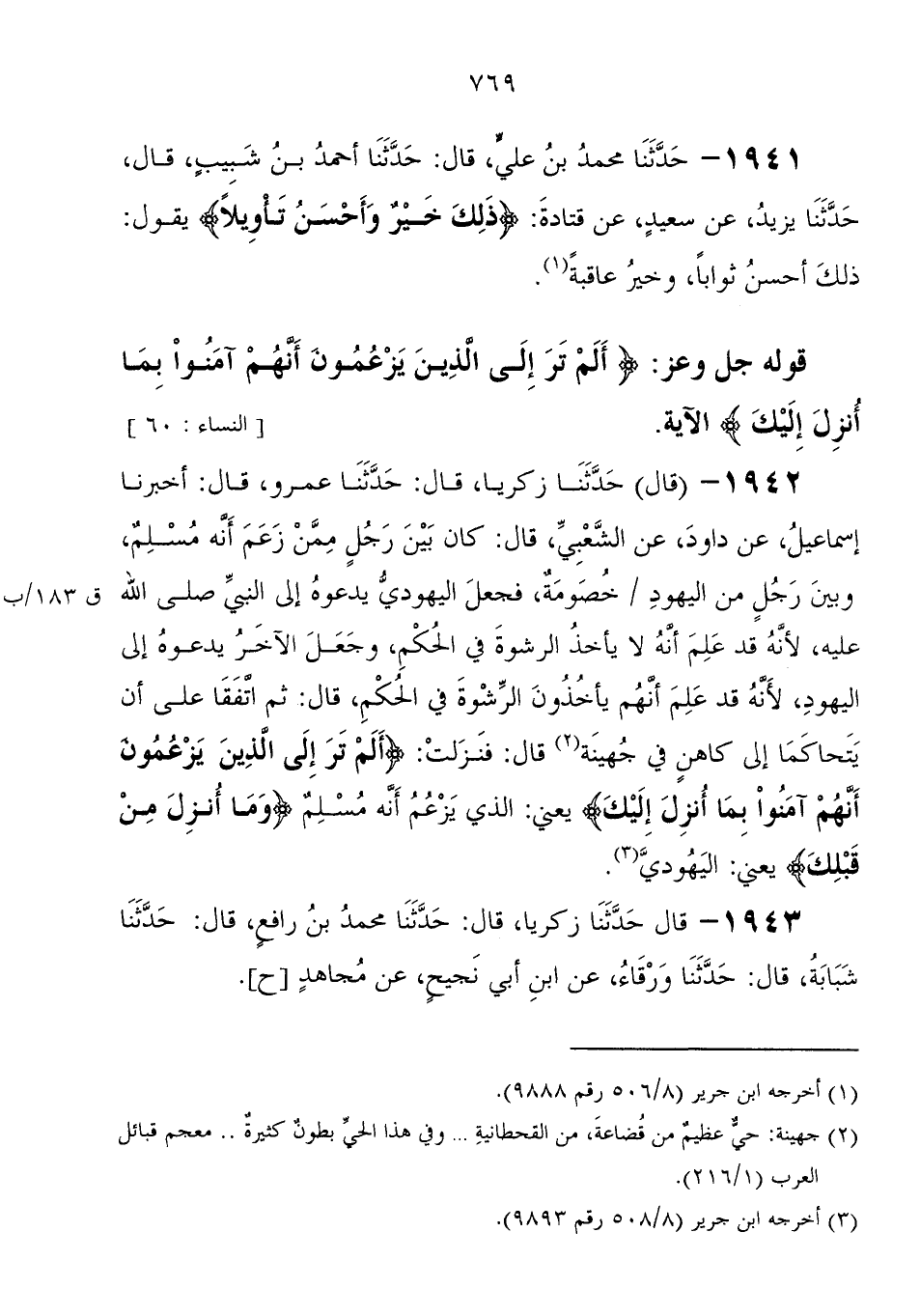 1942 - قَالَ: حَدَّثَنَا زكريا، قَالَ: حَدَّثَنَا عمرو، قَالَ: أَخْبَرَنَا إسماعيل، عَنْ داود، عَنِ الشَّعْبِيِّ، قَالَ " كَانَ بين رجل ممن زعم أنه مسلم وبين رجل من اليهود خصومة، فجعل اليهودي يدعوه إِلَى النَّبِيّ صَلَّى اللَّهُ عَلَيْهِ وَسَلَّمَ، لأنه قد علم أنه لا يأخذ الرشوة فِي الحكم، وجعل الآخر يدعوه إِلَى اليهود، لأنه قد علم أنهم يأخذون الرشوة فِي الحكم، قَالَ: ثم اتفقا عَلَى أن يتحاكما إِلَى كاهن فِي جهينة، قَالَ: فنزلت: {أَلَمْ تَرَ إِلَى الَّذِينَ يَزْعُمُونَ أَنَّهُمْ آمَنُوا بِمَا أُنْزِلَ إِلَيْكَ} ، يعني: الَّذِي يزعم أنه مسلم {وَمَا أُنْزِلَ مِنْ قَبْلِكَ} يعني: اليهودي " قَالَ: حَدَّثَنَا زكريا،