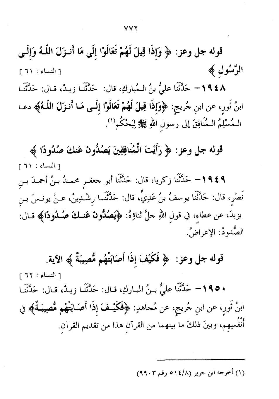 1948 - حَدَّثَنَا عَلِيُّ بْنُ الْمُبَارَكِ، قَالَ: حَدَّثَنَا زَيْدٌ، قَالَ: حَدَّثَنَا ابْنُ ثَوْرٍ، عَنْ ابْن جريج: " {وَإِذَا قِيلَ لَهُمْ تَعَالَوْا إِلَى مَا أَنْزَلَ اللهُ} دعا المسلم المنافق إِلَى رَسُول اللهِ صَلَّى اللَّهُ عَلَيْهِ وَسَلَّمَ ليحكم "
