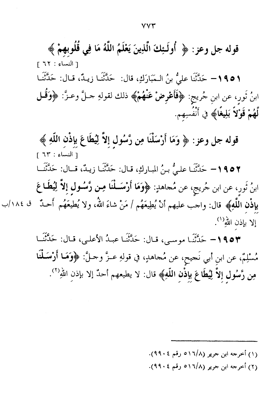 1953 - حَدَّثَنَا مُوسَى، قَالَ: حَدَّثَنَا عَبْد الأعلى، قَالَ: حَدَّثَنَا مسلم، عَنْ ابْن أبي نجيح، عَنْ مجاهد، فِي قوله عَزَّ وَجَلَّ " {وَمَا أَرْسَلْنَا مِنْ رَسُولٍ إِلا لِيُطَاعَ بِإِذْنِ اللهِ} قَالَ: لا يطيعهم أحد إِلا بإذن الله "