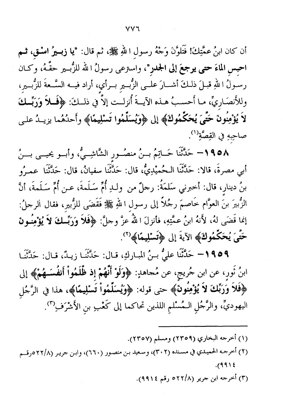 1958 - حَدَّثَنَا حَاتِمُ بْنُ مَنْصُورٍ الشَّاشِيُّ، وَأَبُو يَحْيَى بْنُ أَبِي مصرة، قالا: حَدَّثَنَا الْحُمَيْدِيُّ، قَالَ: حَدَّثَنَا سُفْيَانُ، قَالَ: حَدَّثَنَا عَمْرُو بُْن دِينَارٍ، قَالَ: أَخْبَرَنِي سَلَمَةُ، رَجُلٌ مِنْ وَلَدِ أُمِّ سَلَمَةَ، عَنْ أُمِّ سَلَمَةَ، " أَنَّ الزُّبَيْرَ بْنَ الْعَوَّامِ خَاصَمَ رَجُلا إِلَى رَسُولِ اللهِ صَلَّى اللَّهُ عَلَيْهِ وَسَلَّمَ، فَقَضَى لِلزُّبَيْرِ، فَقَالَ الرَّجُلُ: إِنَّمَا قَضَى لَهُ لأَنَّهُ ابْنُ عَمَّتِهِ، فَأَنْزَلَ اللهُ عَزَّ وَجَلَّ: {فَلا وَرَبِّكَ لا يُؤْمِنُونَ حَتَّى يُحَكِّمُوكَ الآيَةَ إِلَى تَسْلِيمًا} "