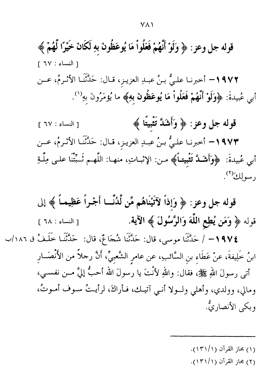 1973 - أَخْبَرَنَا علي بْن عَبْدِ العزيز، قَالَ: حَدَّثَنَا الأثرم، عَنْ عبيدة: " {وَأَشَدَّ تَثْبِيتًا} من: الإثبات، منها: اللهُمَّ ثبتنا عَلَى ملة رسولك "