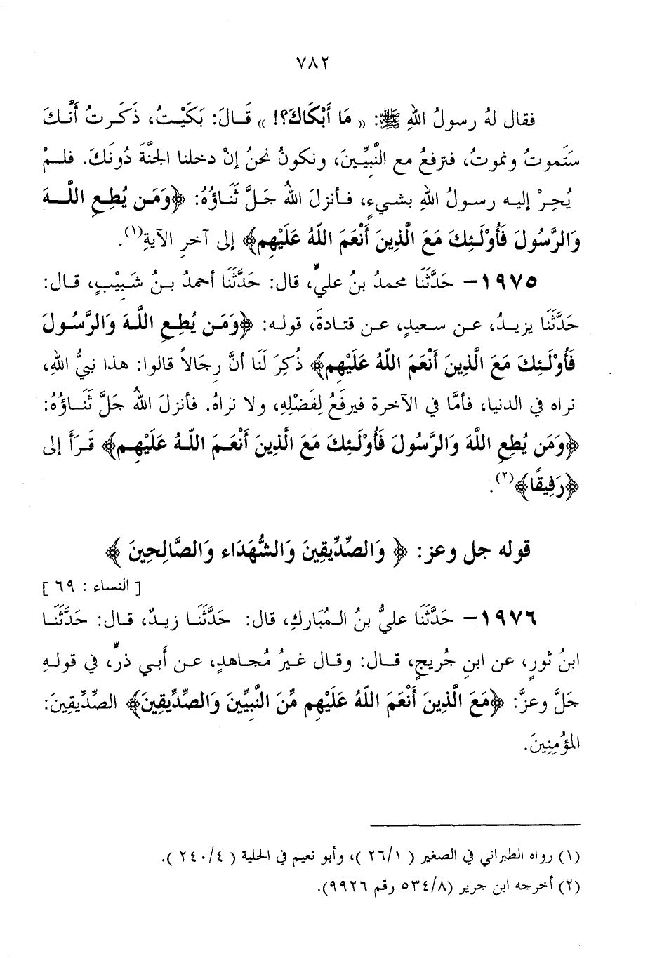 1975 - حَدَّثَنَا مُحَمَّد بْن علي، قَالَ: حَدَّثَنَا أَحْمَدُ بْنُ شبيب، قَالَ: حَدَّثَنَا يزيد، عَنْ سعيد، عَنْ قتادة، قوله " {وَمَنْ يُطِعِ اللهَ وَالرَّسُولَ فَأُولَئِكَ مَعَ الَّذِينَ أَنْعَمَ اللهُ عَلَيْهِمْ} ذكر لنا أن رجالا قَالُوا: هَذَا نبي الله، نراه فِي الدنيا، فأما فِي الآخرة فيرفع لفضله ولا نراه، فأنزل الله جل ثناؤه: {وَمَنْ يُطِعِ اللهَ وَالرَّسُولَ فَأُولَئِكَ مَعَ الَّذِينَ أَنْعَمَ اللهُ عَلَيْهِمْ قرأ إِلَى رَفِيقًا} "