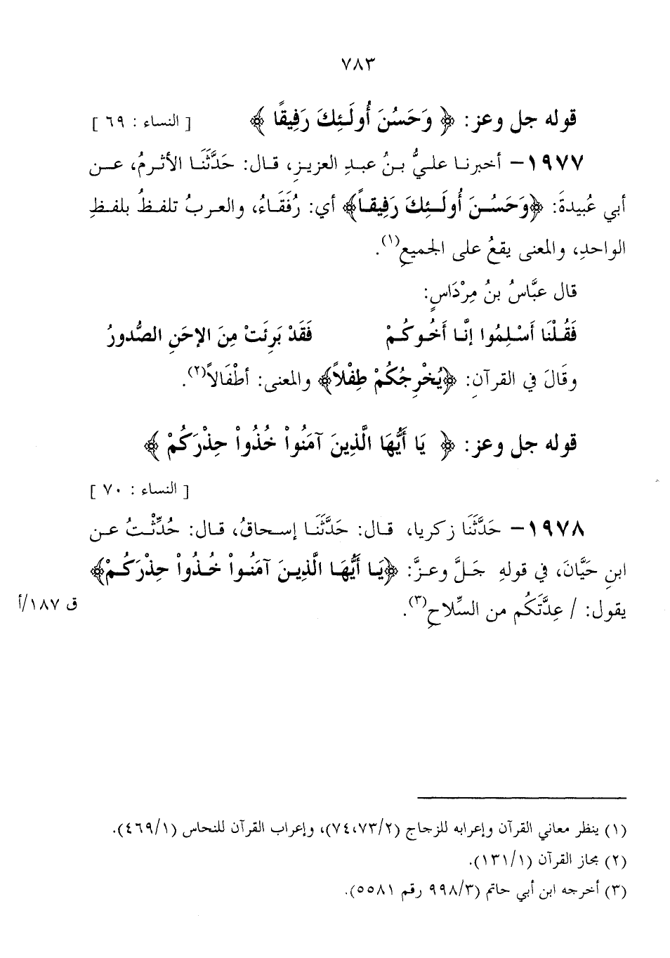 1977 - أَخْبَرَنَا علي بْن عَبْدِ العزيز، قَالَ: حَدَّثَنَا الأثرم، عَنْ أبي عبيدة: " {وَحَسُنَ أُولَئِكَ رَفِيقًا} أي رفقاء "، والعرب تلفظ بلفظ الواحد والمعنى يقع عَلَى الجميع قَالَ عَبَّاس بْن مرداس: فقلنا أسلموا أنا أخوكم فقد برئت من الإحن الصدور وَقَالَ فِي القرآن: {يُخْرِجُكُمْ طِفْلا} والمعنى: أطفالا