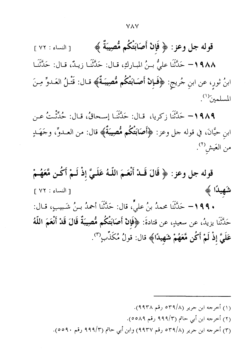 1990 - حَدَّثَنَا مُحَمَّد بْن علي، قَالَ: حَدَّثَنَا أَحْمَدُ بْنُ شبيب، قَالَ: حَدَّثَنَا يزيد، عَنْ سعيد، عَنْ قتادة " {فَإِنْ أَصَابَتْكُمْ مُصِيبَةٌ قَالَ قَدْ أَنْعَمَ اللهُ عَلَيَّ إِذْ لَمْ أَكُنْ مَعَهُمْ شَهِيدًا} قَالَ: قول مكذب "