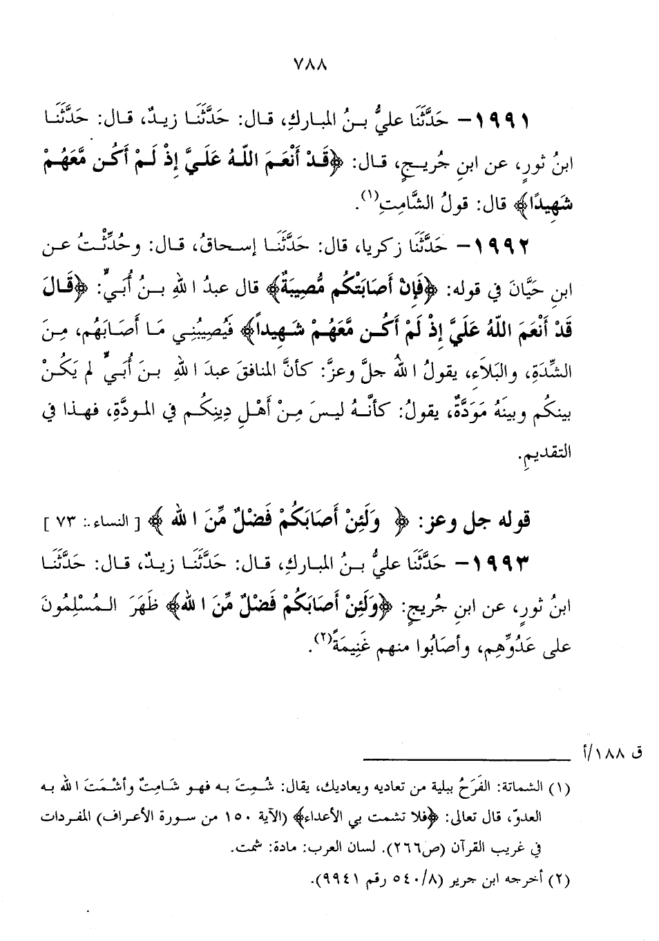 1993 - حَدَّثَنَا عَلِيُّ بْنُ الْمُبَارَكِ، قَالَ حَدَّثَنَا زيد، قَالَ حَدَّثَنَا ابْن ثور، عَنْ ابْن جريج: " {وَلَئِنْ أَصَابَكُمْ فَضْلٌ مِنَ اللهِ} ظهر المسلمون عَلَى عدوهم، وأصابوا منه الغنيمة "