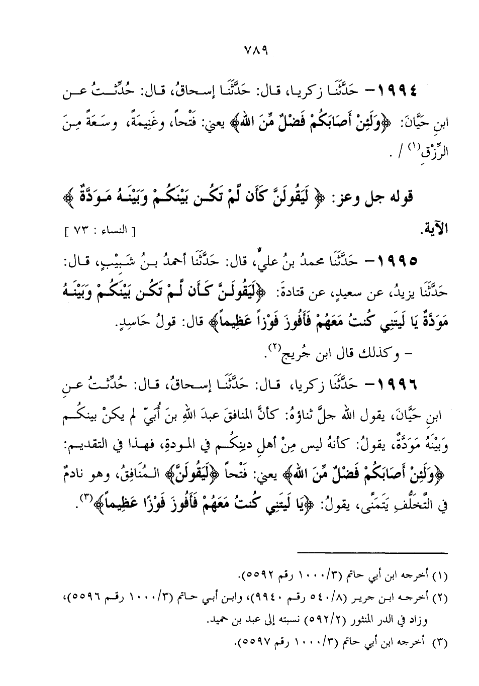 1996 - حَدَّثَنَا زكريا، قَالَ حَدَّثَنَا إِسْحَاق، قَالَ: حدثت عَنْ ابْن حيان، " يَقُول الله جل ثناؤه: كأن المنافق عَبْد اللهِ بْن أبي لم يكن بينكم وبينه مودة، كأنه ليس من أهل دينكم فِي المودة، فهذا فِي التقديم: {وَلَئِنْ أَصَابَكُمْ فَضْلٌ مِنَ اللهِ} يعني: فتحا {لَيَقُولَنَّ} المنافق، وَهُوَ نادم فِي التخلف يتمنى، يَقُول: {يَا لَيْتَنِي كُنْتُ مَعَهُمْ فَأَفُوزَ فَوْزًا عَظِيمًا} "