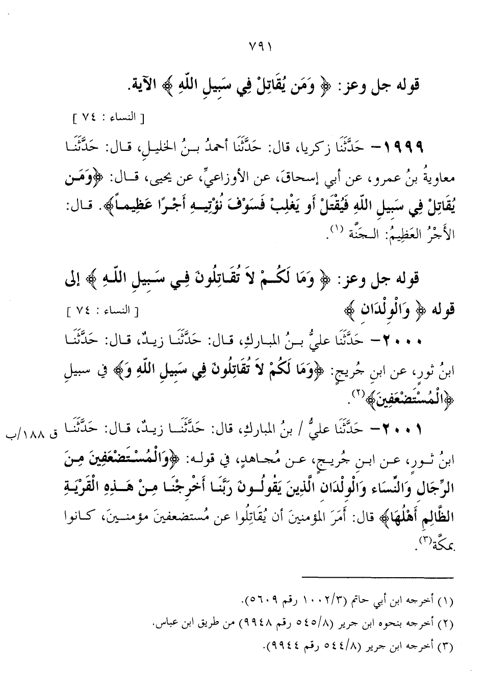 2001 - حَدَّثَنَا عَلِيُّ بْنُ الْمُبَارَكِ، قَالَ: حَدَّثَنَا زَيْدٌ، قَالَ: حَدَّثَنَا ابْنُ ثَوْرٍ، عَنِ ابْنِ جُرَيْجٍ، عَنْ مجاهد، فِي قوله " {مِنَ الرِّجَالِ وَالنِّسَاءِ وَالْوِلْدَانِ الَّذِينَ يَقُولُونَ رَبَّنَا أَخْرِجْنَا مِنْ هَذِهِ الْقَرْيَةِ الظَّالِمِ أَهْلُهَا} قَالَ: أمر المؤمنين أن يقاتلوا عَنْ مستضعفين مؤمنين كَانُوا بمكة "