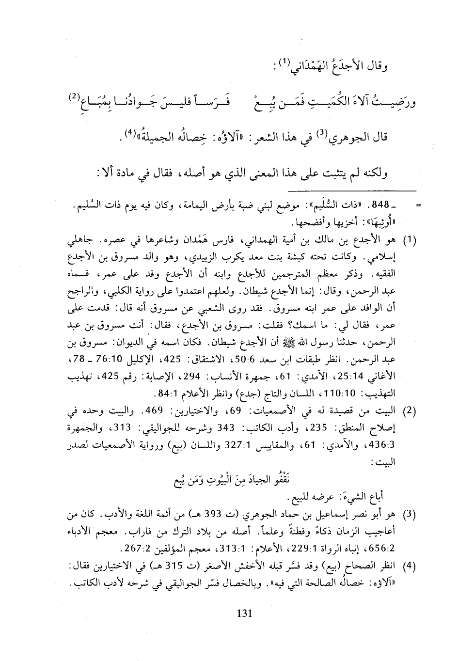 (¬4) انظر الصحاح (بيع) وقد فسَّر قبله الأخفش الأصغر (ت 315 هـ) في الاختيارين فقال: "آلاؤه: خصالُه الصالحة التي فيه". وبالخصال فسّر الجواليقي في شرحه لأدب الكاتب.