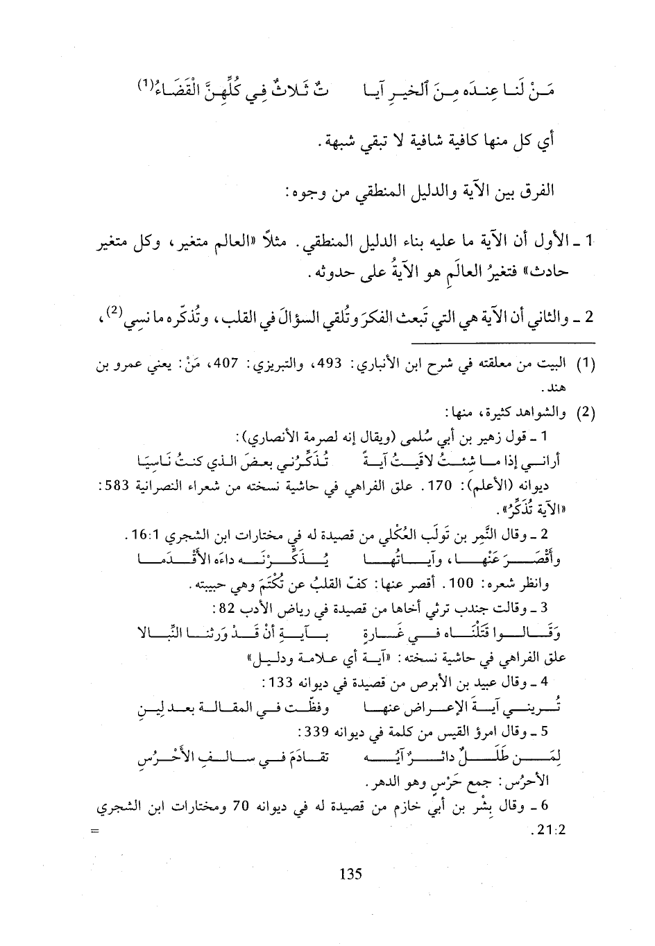 1 - الأول أن الآية ما عليه بناء الدليل المنطقي. مثلاً "العالم متغير، وكل متغير حادث" فتغيرُ العالَمِ هو الآيةُ على حدوثه.