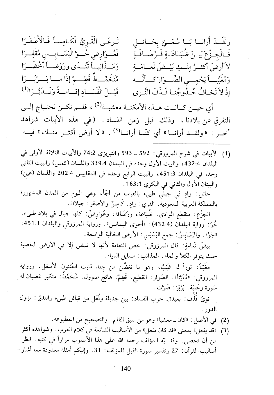 الجِزْع: منقطع الوادي. ضُبَاعة، ورُصَافة، وعُوَارِضٌ: كلها جبال في بلاد طيئ. حُوّ: رواية البلدان (4: 432): "أحوى البسابس". ورواية المرزوقي والبلدان 3: 451: "جَوَّ". والبَسَابِسُ: جمع البَسْبَسِ: الأرض الخالية الواسعة.