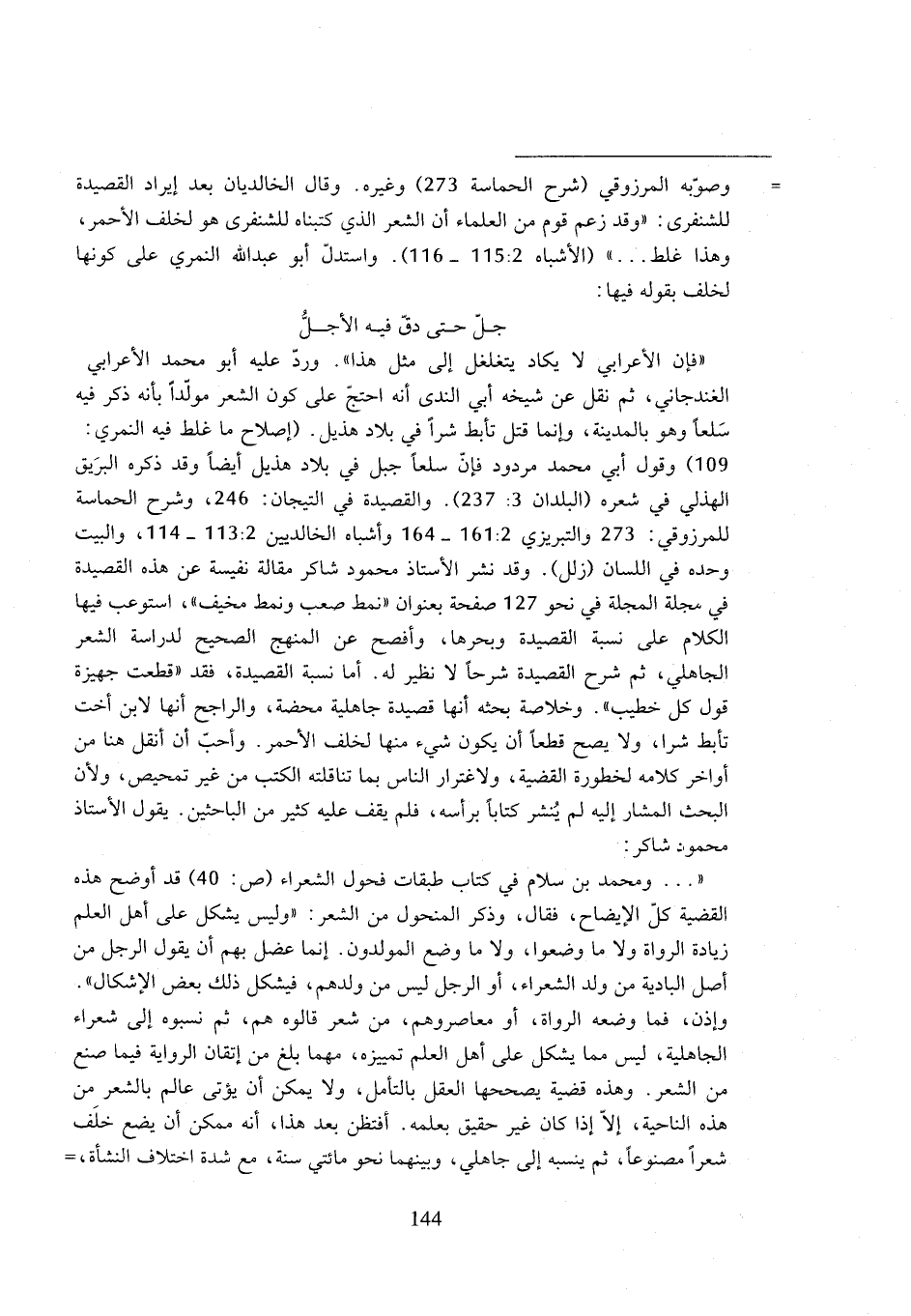 "فإن الأعرابي لا يكاد يتغلغل إلى مثل هذا". وردّ عليه أبو محمد الأعرابي الغندجاني، ثم نقل عن شيخه أبي الندى أنه احتجّ على كون الشعر مولّداً بأنه ذكر فيه سَلعاً وهو بالمدينة، وإنما قتل تأبط شراً في بلاد هذيل. (إصلاح ما غلط فيه النمري: 109) وقول أبي محمد مردود فإنّ سلعاً جبل في بلاد هذيل أيضاً وقد ذكره البرَيق الهذلي في شعره (البلدان 3: 237). والقصيدة في التيجان: 246، وشرح الحماسة للمرزوقي: 273 والتبريزي 2: 161 - 164 وأشباه الخالديين 2: 113 - 114، والبيت وحده في اللسان (زلل). وقد نشر الأستاذ محمود شاكر مقالة نفيسة عن هذه القصيدة في مجلة المجلة في نحو 127 صفحة بعنوان "نمط صعب ونمط مخيف"، استوعب فيها الكلام على نسبة القصيدة وبحرها، وأفصح عن المنهج الصحيح لدراسة الشعر الجاهلي، ثم شرح القصيدة شرحاً لا نظير له. أما نسبة القصيدة، فقد "قطعت جهيزة قول كل خطيب". وخلاصة بحثه أنها قصيدة جاهلية محضة، والراجح أنها لابن أخت تأبط شرا، ولا يصح قطعاً أن يكون شيء منها لخلف الأحمر. وأحبّ أن أنقل هنا من أواخر كلامه لخطورة القضية، ولاغترار الناس بما تناقلته الكتب من غير تمحيص، ولأن البحث المشار إليه لم يُنشر كتاباً برأسه، فلم يقف عليه كثير من الباحثين. يقول الأستاذ محمود شاكر: