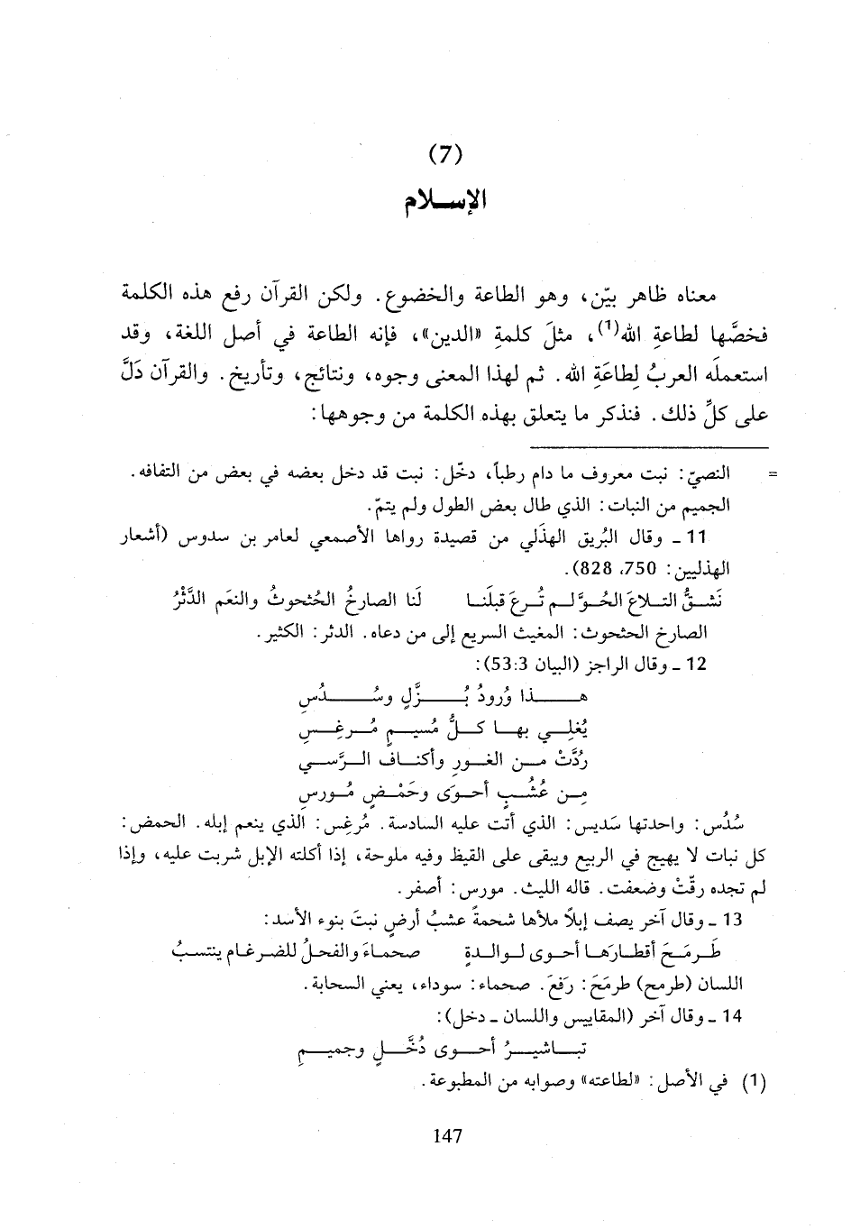 معناه ظاهر بيّن، وهو الطاعة والخضوع. ولكن القرآن رفع هذه الكلمة فخصَّها لطاعةِ الله (¬1)، مثلَ كلمةِ "الدين"، فإنه الطاعة في أصل اللغة، وقد استعملَه العربُ لِطاعَةِ الله. ثم لهذا المعنى وجوه، ونتائج، وتأريخ. والقرآن دَلَّ على كل ذلك. فنذكر ما يتعلق بهذه الكلمة من وجوهها: