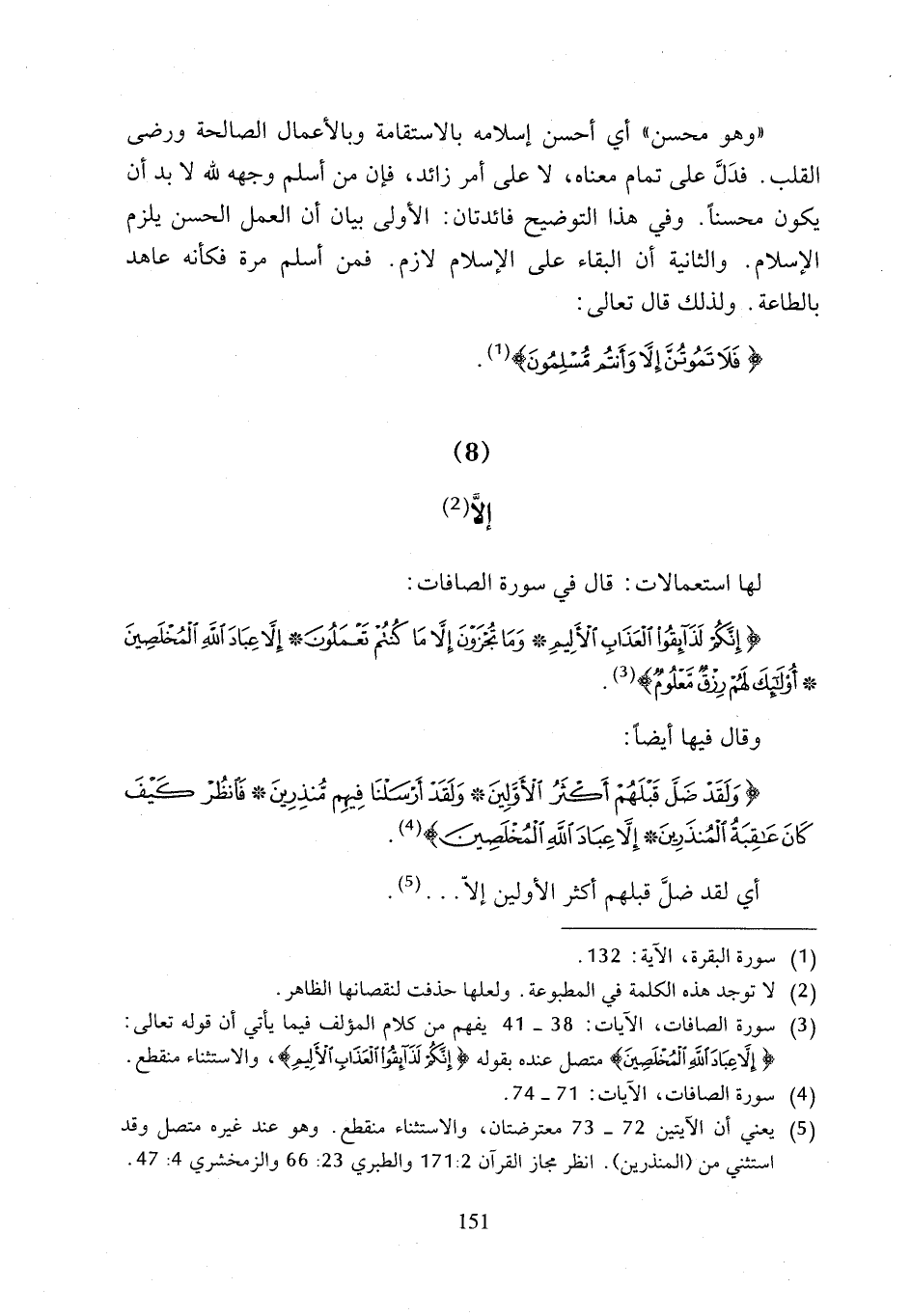 (¬3) سورة الصافات، الآيات: 38 - 41 يفهم من كلام المؤلف فيما يأتي أن قوله تعالى: {إِلَّا عِبَادَ اللَّهِ الْمُخْلَصِينَ} متصل عنده بقوله {إِنَّكُمْ لَذَائِقُو الْعَذَابِ الْأَلِيمِ}، والاستثناء منقطع.