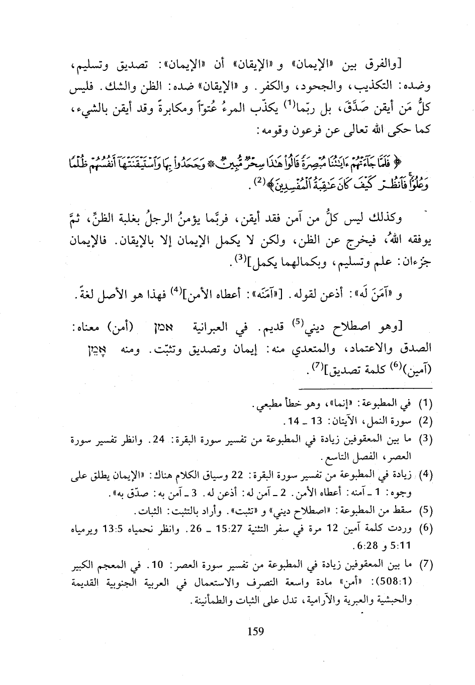 (¬7) ما بين المعقوفين زيادة في المطبوعة من تفسير سورة العصر: 10. في المعجم الكبير (1: 508): "أمن" مادة واسعة التصرف والاستعمال في العربية الجنوبية القديمة والحبشية والعبرية والآرامية، تدل على الثبات والطمأنينة.