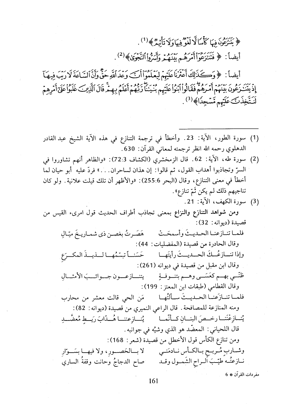 (¬2) سورة طه، الآية: 62. قال الزمخشري (الكشاف 3: 72): "والظاهر أنهم تشاوروا في السرّ وتجاذبوا أهداب القول، ثم قالوا: إن هذان لساحران ... " فردّ عليه أبو حيان لما أخطأ في معنى التنازع، وقال (البحر 6: 255): "والأظهر أن تلك قيلت علانية. ولو كان تناجيهم ذلك لم يكن ثَمّ تنازع".