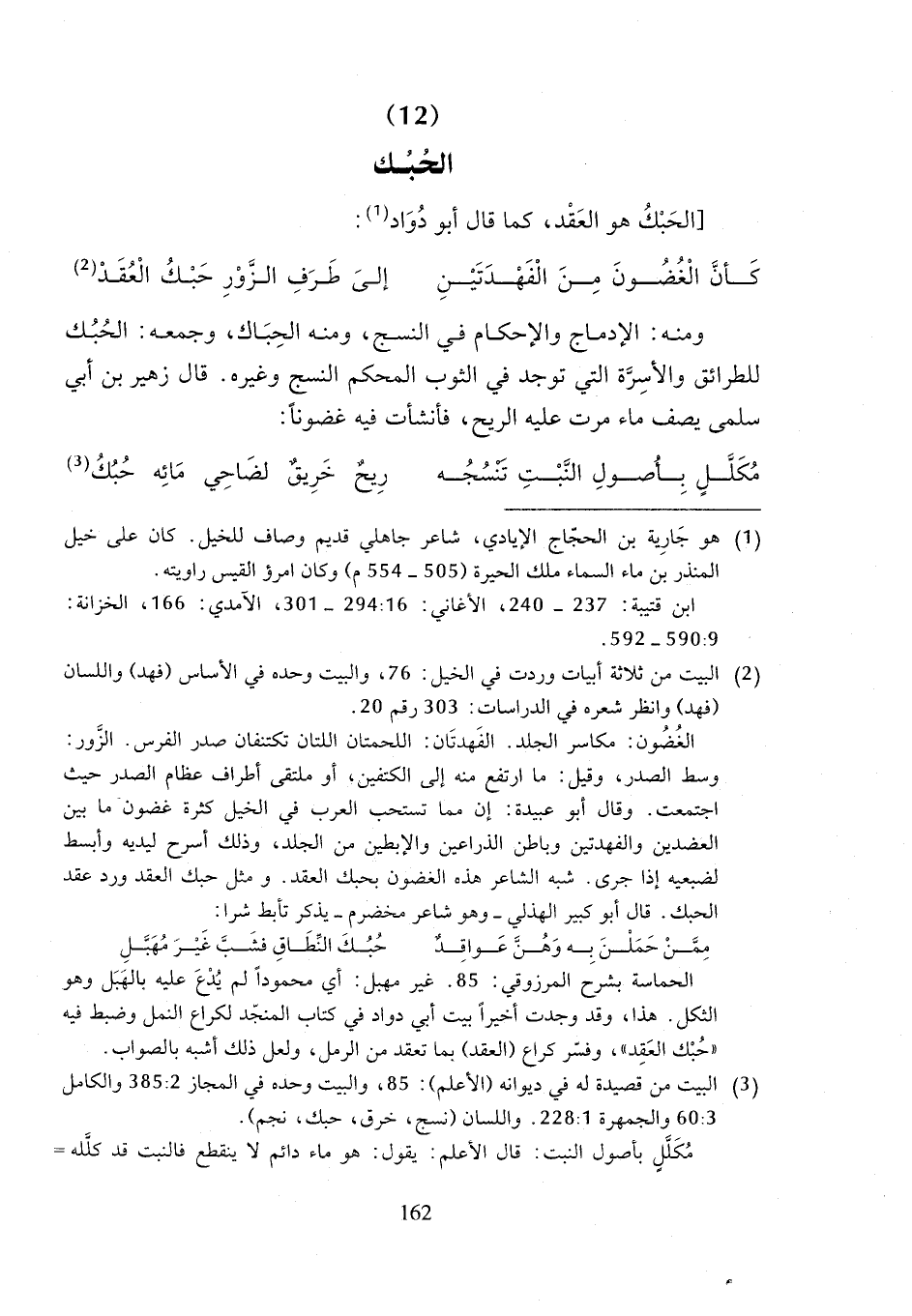 الحماسة بشرح المرزوقي: 85. غير مهبل: أي محموداً لم يُدْعَ عليه بالهَبَل والثكل. هذا، وقد وجدت أخيراً بيت أبي دواد في كتاب المنجّد لكراع النمل وضبط فيه "حُبْك العَقِد"، وفسّر كراع (العقد) بما تعقد من الرمل، ولعل ذلك أشبه بالصواب.