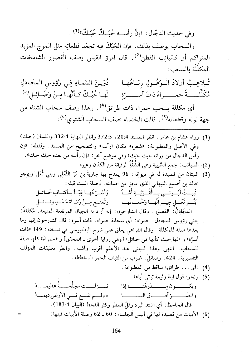 المجَادِلُ: القصور. وقال الشارحون: إنه أراد به الجبال المرتفعة المنيعة. مُكللةً: يعني رؤوس المجادل. حمراء: أي سحابة حمراء. ذات أسرة: قال الشارحون إنها وما بعدها صفة للمكللة. وقال الفراهي يعلق على شرح البطليوسى في نسخته: 149 "ذات أسرَّة" و "لها حبك كأنها من حبائل" [وهي رواية أخرى - المحقق] و "حمراءُ" كلها صفة للسحاب. انتهى وهذا المعنى عند الأعلم أقرب وأشبه. وانظر تعليقات المؤلف التفسيرية: 424. وصائل: ضرب من الثياب الحمر المخططة.