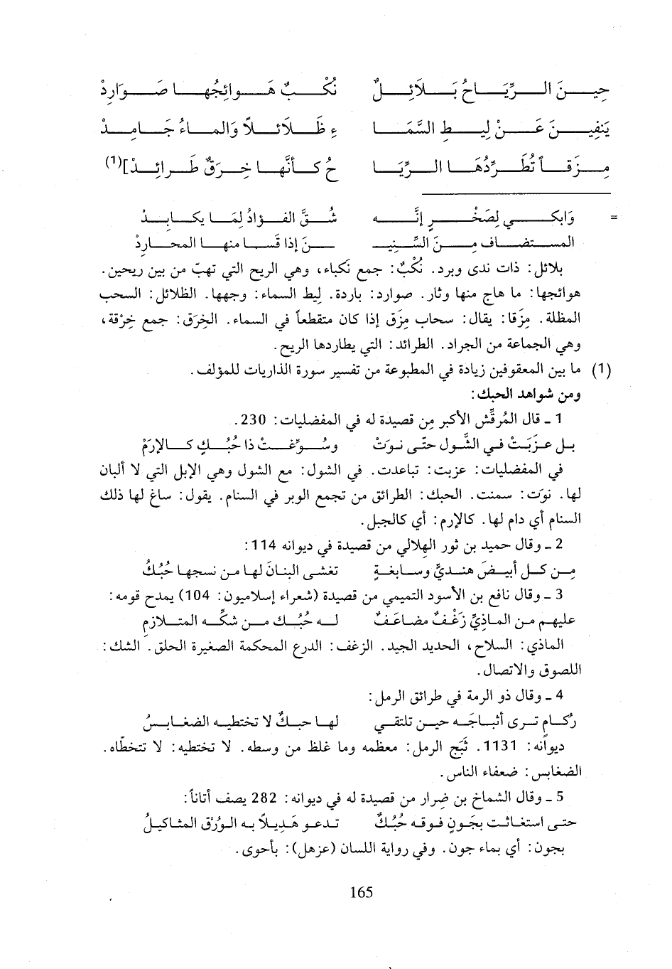 بلائل: ذات ندى وبرد. نُكْبٌ: جمع نَكباء، وهي الريح التي تهبّ من بين ريحين. هوائجها: ما هاج منها وثار. صوارد: باردة. لِيط السماء: وجهها. الظلائل: السحب المظلة. مِزَقا: يقال: سحاب مِزَق إذا كان متقطعاً في السماء. الخِرَق: جمع خِرْقة، وهي الجماعة من الجراد. الطرائد: التي يطاردها الريح.