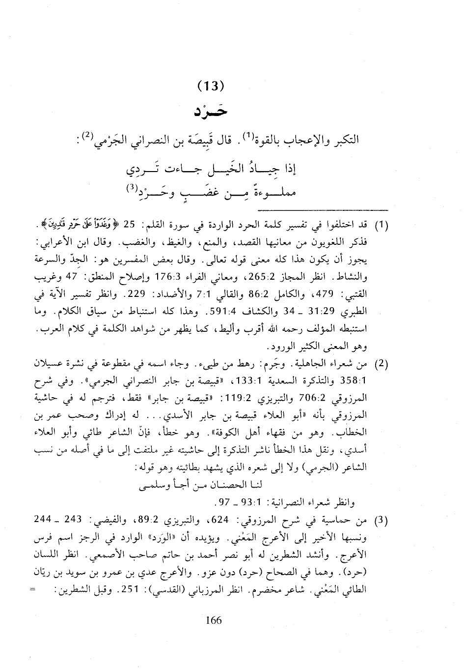 (¬1) قد اختلفوا في تفسير كلمة الحرد الواردة في سورة القلم: 25 {وغدوا على حردٍ قادرين}. فذكر اللغويون من معانيها القصد، والمنع، والغيظ، والغضب. وقال ابن الأعرابي: يجوز أن يكون هذا كله معنى قوله تعالى. وقال بعض المفسرين هو: الجِدّ والسرعة والنشاط. انظر المجاز 2: 262، ومعاني الفراء 3: 176 وإصلاح المنطق: 47 وغريب القتبي: 479، والكامل 2: 86 والقالي 1:7 والأضداد: 229. وانظر تفسير الآية في الطبري 29: 31 - 34 والكشاف 4: 591. وهذا كله استنباط من سياق الكلام. وما استنبطه المؤلف رحمه الله أقرب وأليط، كما يظهر من شواهد الكلمة في كلام العرب. وهو المعنى الكثير الورود.