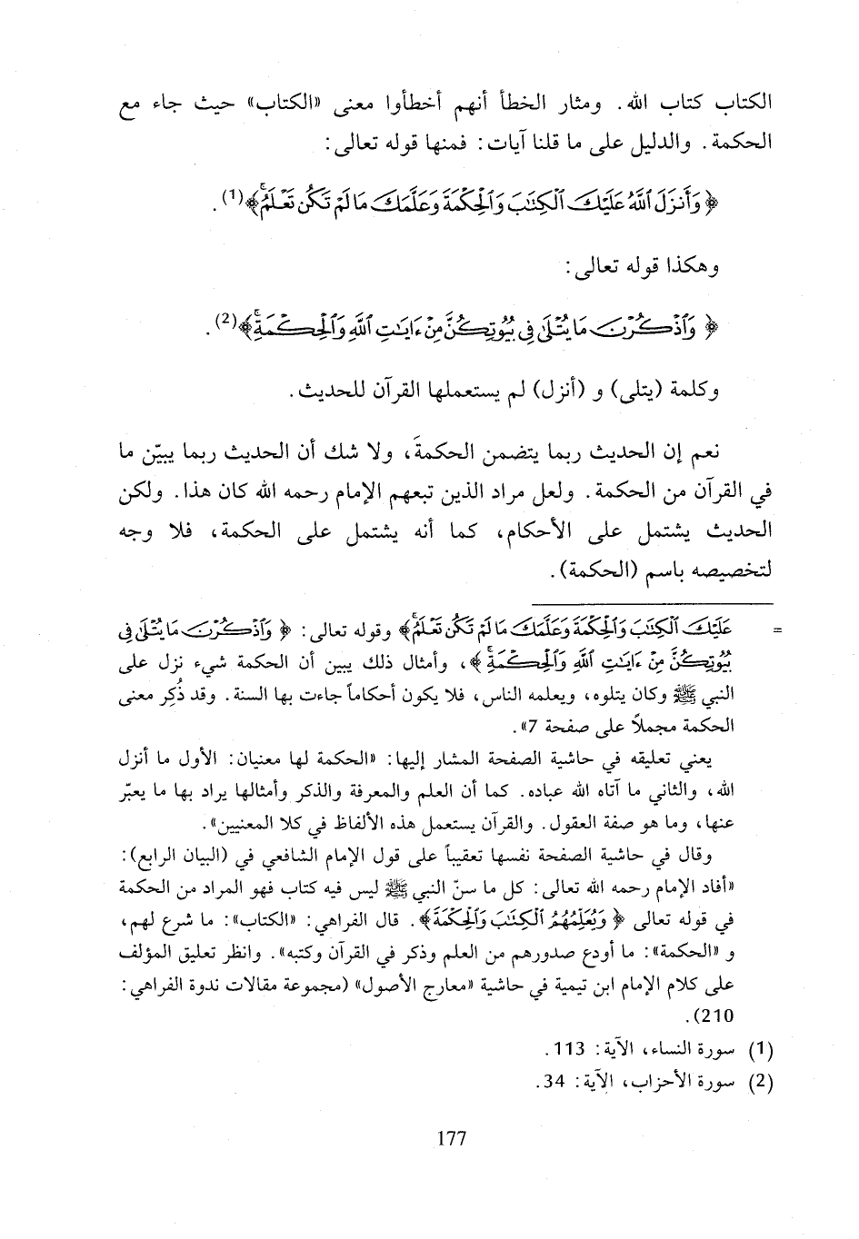 = عَلَيْكَ الْكِتَابَ وَالْحِكْمَةَ وَعَلَّمَكَ مَا لَمْ تَكُنْ تَعْلَمُ} وقوله تعالى: {وَاذْكُرْنَ مَا يُتْلَى فِي بُيُوتِكُنَّ مِنْ آيَاتِ اللَّهِ وَالْحِكْمَةِ}، وأمثال ذلك يبين أن الحكمة شيء نزل على النبي - صلى الله عليه وسلم - وكان يتلوه، ويعلمه الناس، فلا يكون أحكاماً جاءت بها السنة. وقد ذُكِر معنى الحكمة مجملاً على صفحة 7".