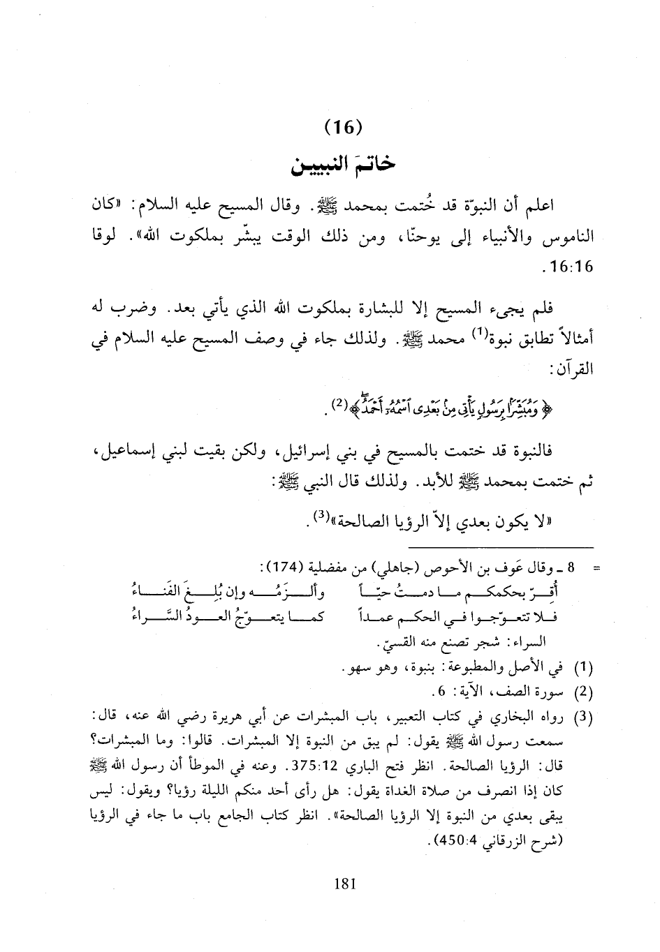 اعلم أن النبوّة قد خُتمت بمحمد - صلى الله عليه وسلم -. وقال المسيح عليه السلام: "كان الناموس والأنبياء إلى يوحنّا، ومن ذلك الوقت يبشّر بملكوت الله". لوقا 16:16.