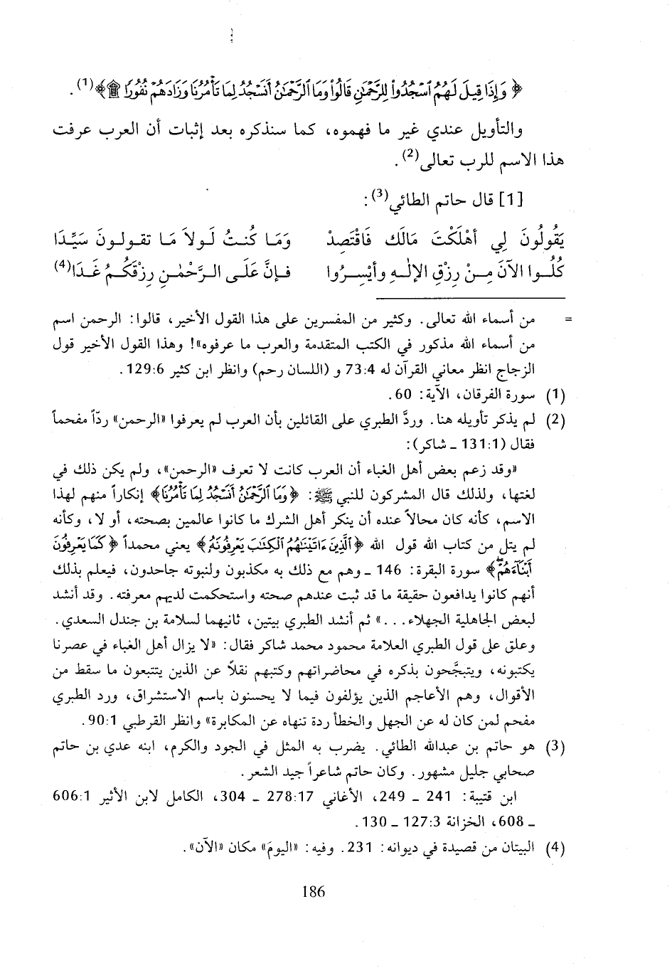 "وقد زعم بعض أهل الغباء أن العرب كانت لا تعرف "الرحمن"، ولم يكن ذلك في لغتها، ولذلك قال المشركون للنبي - صلى الله عليه وسلم -: {وَمَا الرَّحْمَنُ أَنَسْجُدُ لِمَا تَأْمُرُنَا} إنكاراً منهم لهذا الاسم، كأنه كان محالاً عنده أن ينكر أهل الشرك ما كانوا عالمين بصحته، أو لا، وكأنه لم يتل من كتاب الله قول الله {الَّذِينَ آتَيْنَاهُمُ الْكِتَابَ يَعْرِفُونَهُ} يعني محمداً {كَمَا يَعْرِفُونَ أَبْنَاءَهُمُ} سورة البقرة: 146 - وهم مع ذلك به مكذبون ولنبوته جاحدون، فيعلم بذلك أنهم كانوا يدافعون حقيقة ما قد ثبت عندهم صحته واستحكمت لديهم معرفته. وقد أنشد لبعض الجاهلية الجهلاء ... " ثم أنشد الطبري بيتين، ثانيهما لسلامة بن جندل السعدي. وعلق على قول الطبري العلامة محمود محمد شاكر فقال: "لا يزال أهل الغباء في عصرنا يكتبونه، ويتبجَّحون بذكره في محاضراتهم وكتبهم نقلاً عن الذين يتتبعون ما سقط من الأقوال، وهم الأعاجم الذين يؤلفون فيما لا يحسنون باسم الاستشراق، ورد الطبري مفحم لمن كان له عن الجهل والخطأ ردة تنهاه عن المكابرة" وانظر القرطبي 1: 90.