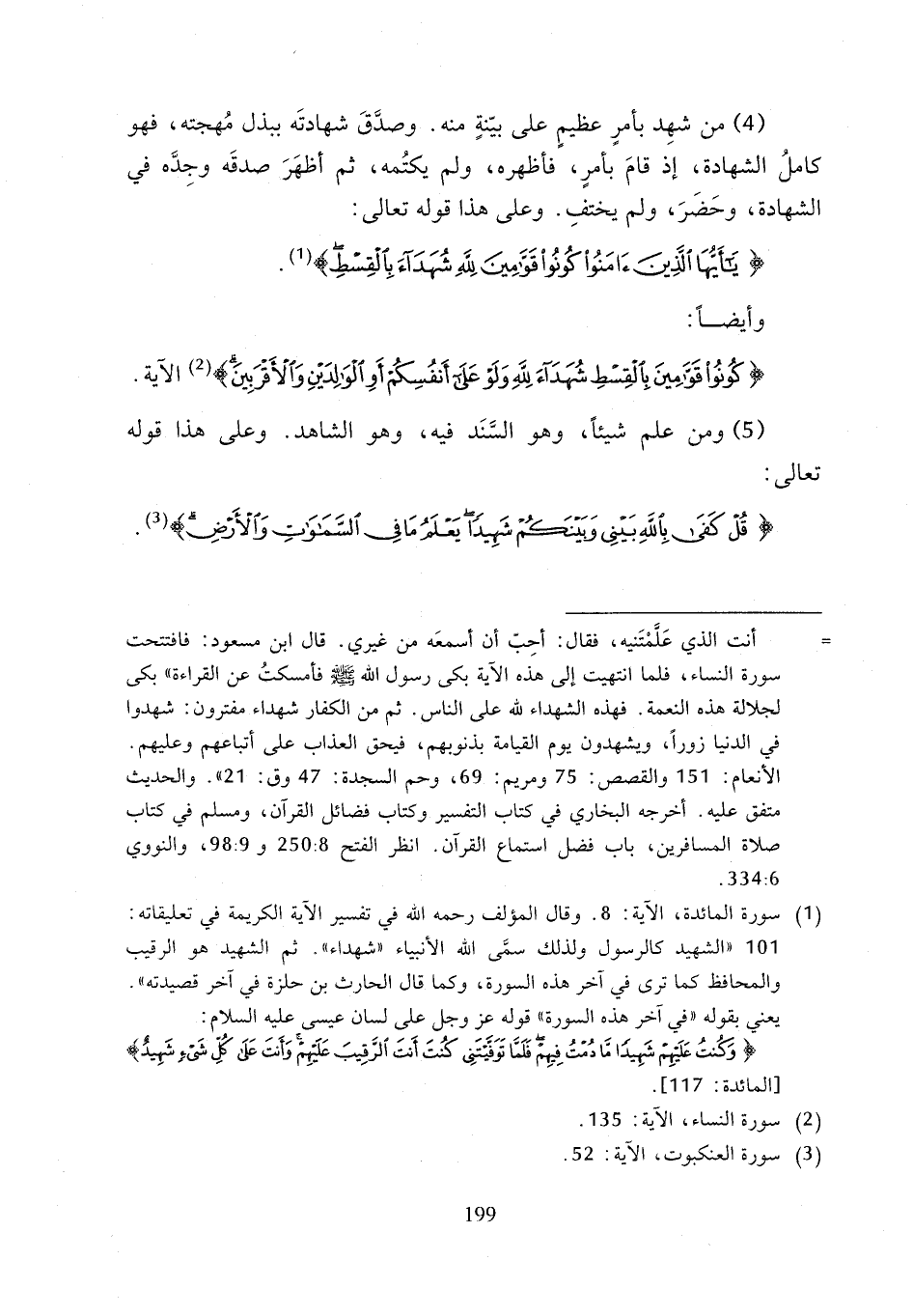 (4) من شهِد بأمرٍ عظيمٍ على بيّنةٍ منه. وصدَّقَ شهادتَه ببذل مُهجته، فهو كاملُ الشهادة، إذ قامَ بأمرٍ، فأظهره، ولم يكتُمه، ثم أظهَرَ صدقَه وجِدَّه في الشهادة، وحَضَرَ، ولم يختفِ. وعلى هذا قوله تعالى: