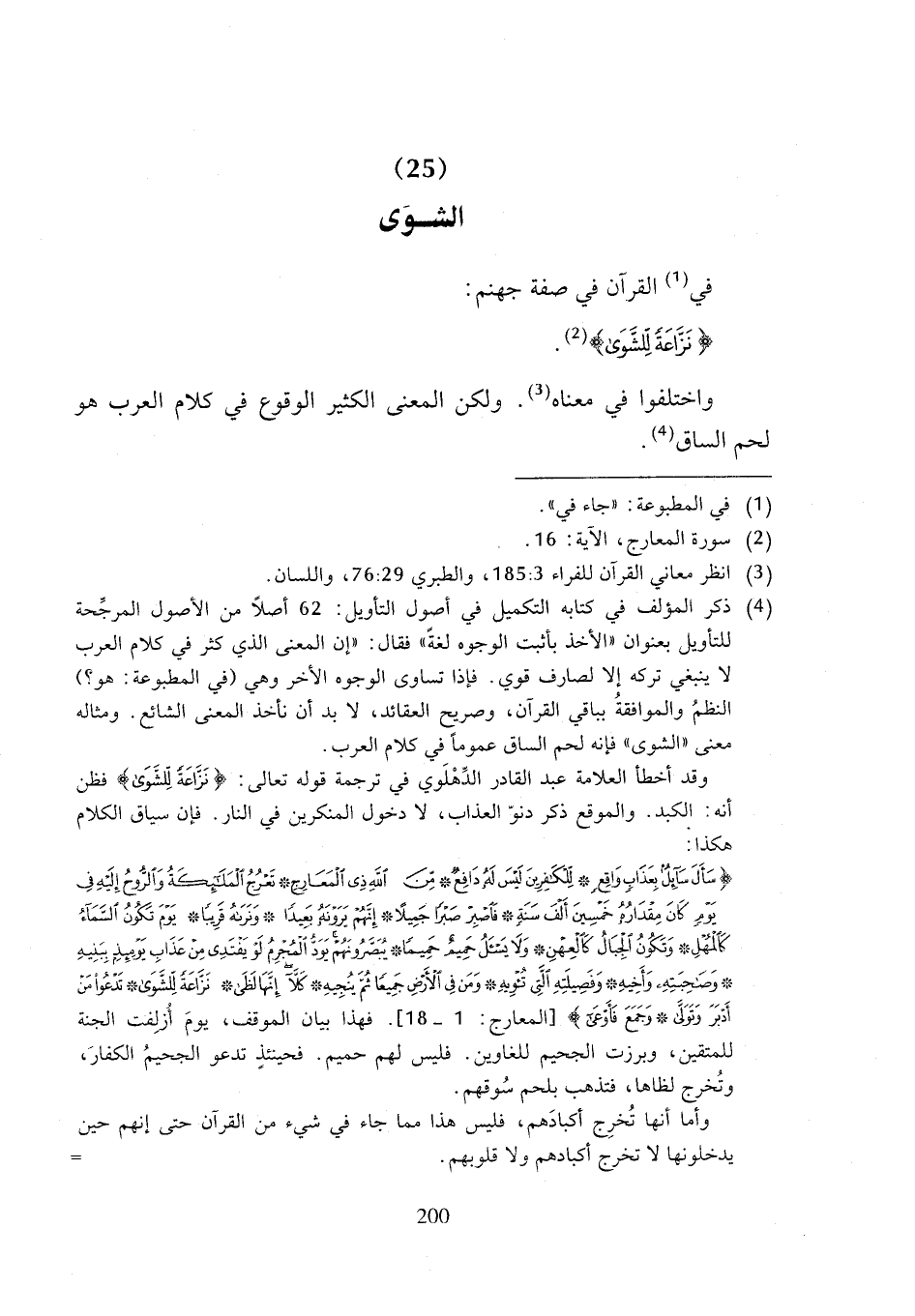(¬4) ذكر المؤلف في كتابه التكميل في أصول التأويل: 62 أصلاً من الأصول المرجِّحة للتأويل بعنوان "الأخذ بأثبت الوجوه لغةً" فقال: "إن المعنى الذي كثر في كلام العرب لا ينبغي تركه إلا لصارف قوي. فإذا تساوى الوجوه الآخر وهي (في المطبوعة: هو؟) النظمُ والموافقةُ بباقي القرآن، وصريح العقائد، لا بد أن نأخذ المعنى الشائع. ومثاله معنى "الشوى" فإنه لحم الساق عموماً في كلام العرب.