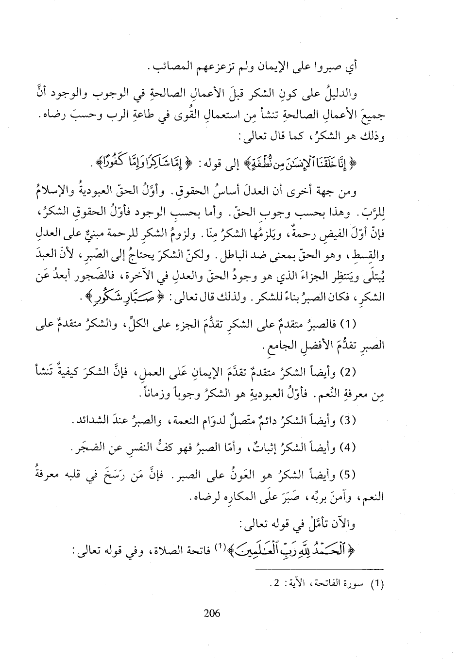 (2) وأيضاً الشكرُ متقدمٌ تقدُّمَ الإيمانِ عَلى العملِ، فإنَّ الشكرَ كيفيةٌ تَنشأ مِن معرفةِ النِّعم. فأوّلُ العبوديةِ هو الشكرُ وجوباً وزماناً.