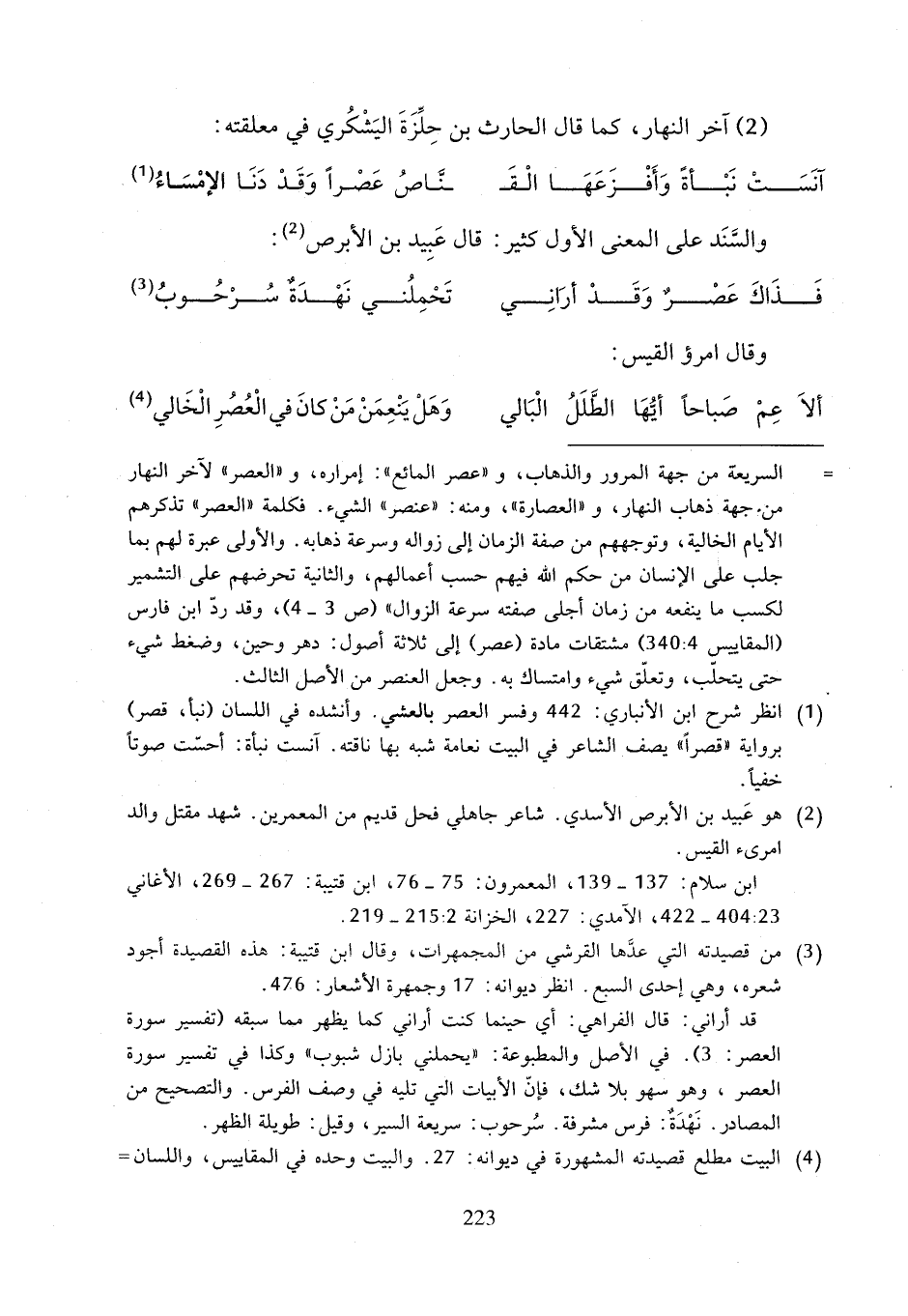 = السريعة من جهة المرور والذهاب، و "عصر المائع": إمراره، و "العصر" لآخر النهار من جهة ذهاب النهار، و "العصارة"، ومنه: "عنصر" الشيء. فكلمة "العصر" تذكرهم الأيام الخالية، وتوجههم من صفة الزمان إلى زواله وسرعة ذهابه. والأولى عبرة لهم بما جلب على الإنسان من حكم الله فيهم حسب أعمالهم، والثانية تحرضهم على التشمير لكسب ما ينفعه من زمان أجلى صفته سرعة الزوال" (ص 3 - 4)، وقد ردّ ابن فارس (المقاييس 4: 340) مشتقات مادة (عصر) إلى ثلاثة أصول: دهر وحين، وضغط شيء حتى يتحلّب، وتعلّق شيء وامتساك به. وجعل العنصر من الأصل الثالث.