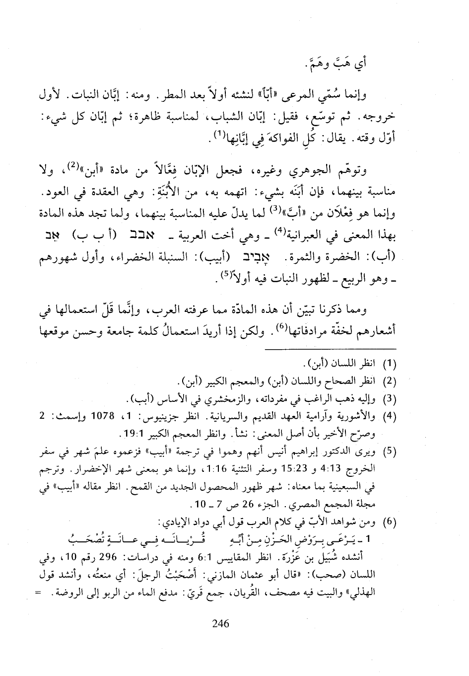 وتوهّم الجوهري وغيره، فجعل الإبّان فِعَّالاً من مادة "أبن" (¬2)، ولا مناسبة بينهما، فإن أبَنَه بشيء: اتهمه به، من الأُبنَةِ: وهي العقدة في العود. وإنما هو فِعْلاَن من "أبَّ" (¬3) لما يدلّ عليه المناسبة بينهما، ولما تجد هذه المادة بهذا المعنى في العبرانية (¬4) -وهي أخت العربية-[. . .] (أب ب) [. . .] (أب): الخضرة والثمرة. [. . .] (أبيب): السنبلة الخضراء، وأول شهورهم -وهو الربيع- لظهور النبات فيه أولاً (¬5).