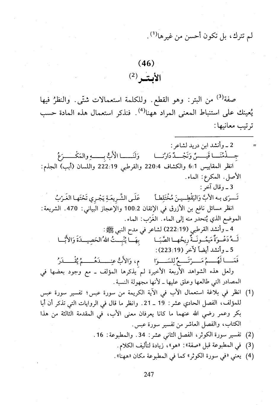 (¬1) انظر في بلاغة استعمال الأب في الآية الكريمة من سورة عبس. تفسير سورة عبس للمؤلف، الفصل الحادي عشر: 19 - 21. وانظر ما قال في الروايات التي تذكر أن أبا بكر وعمر رضي الله عنهما ما كانا يعرفان معنى الأب، في المقدمة الثالثة من هذا الكتاب، والفصل العاشر من تفسير سورة عبس.