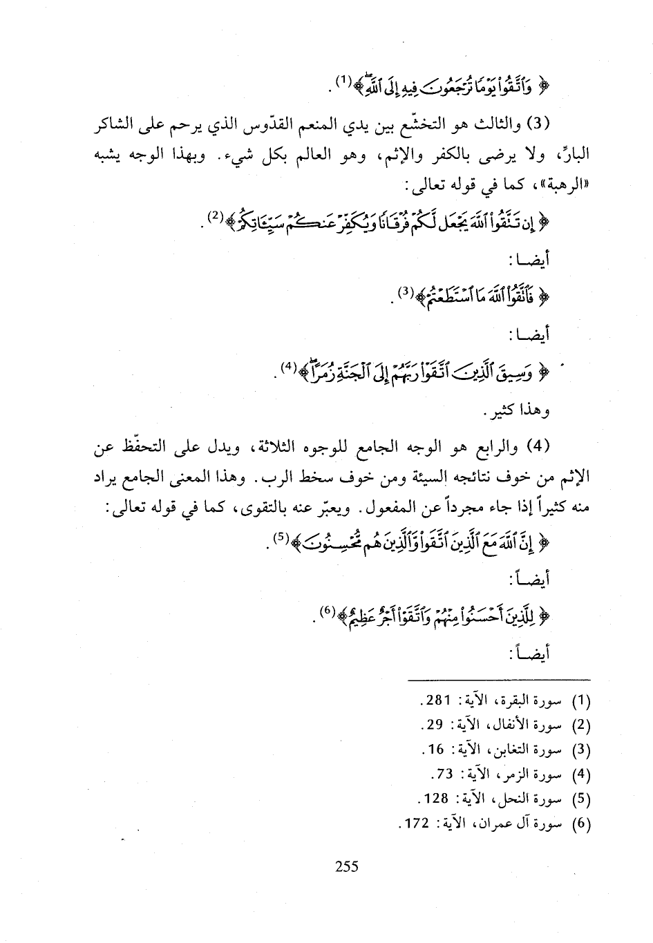 (4) والرابع هو الوجه الجامع للوجوه الثلاثة، ويدل على التحفّظ عن الإثم من خوف نتائجه السيئة ومن خوف سخط الرب. وهذا المعنى الجامع يراد منه كثيراً إذا جاء مجرداً عن المفعول. ويعبّر عنه بالتقوى، كما في قوله تعالى: