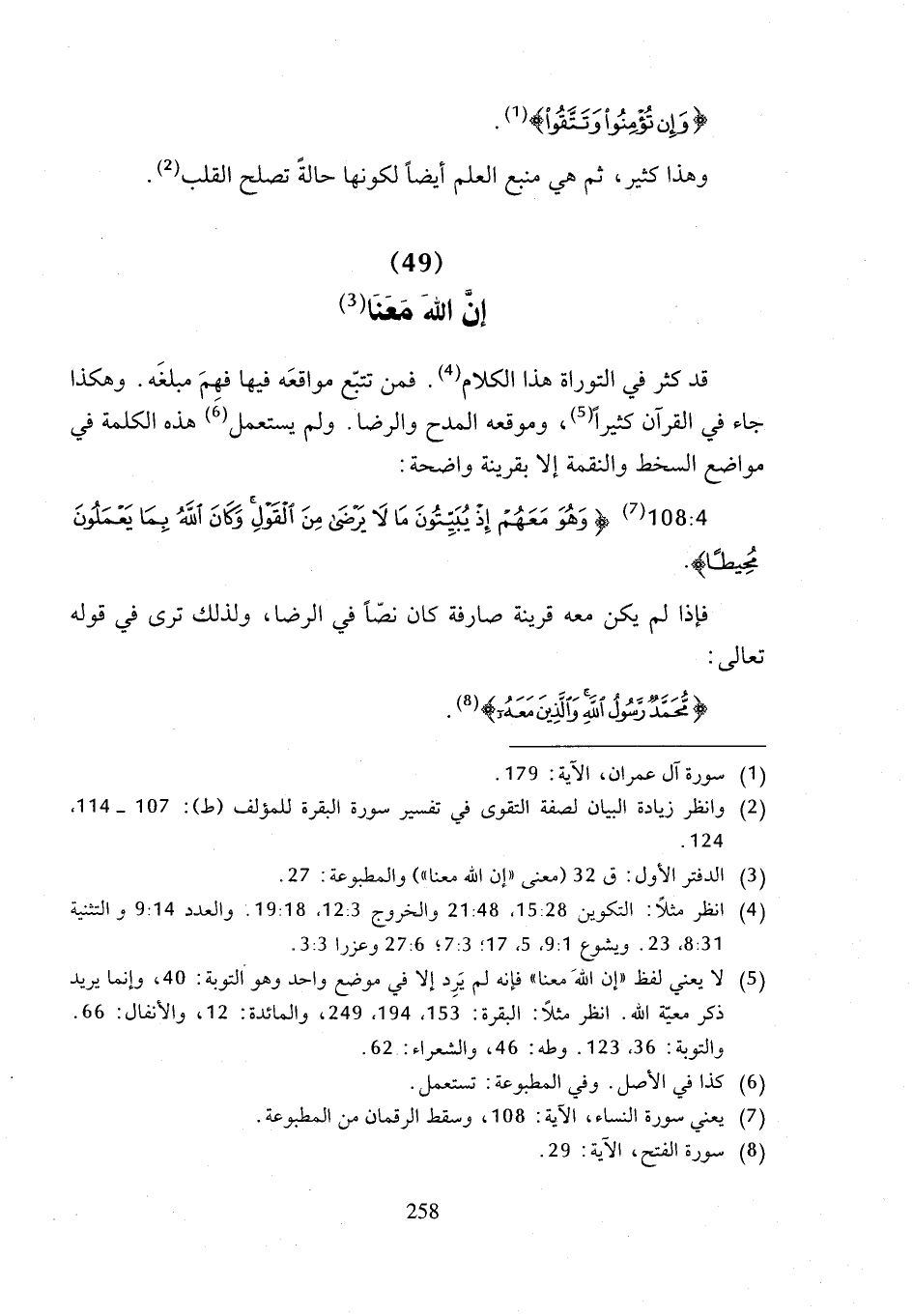 (¬5) لا يعني لفظ "إن اللهَ معنا" فإنه لم يَرِد إلا في موضع واحد وهو التوبة: 40، وإنما يريد ذكر معيّة الله. انظر مثلاً: البقرة: 153، 194، 249، والمائدة: 12، والأنفال: 66. والتوبة: 36، 123. وطه: 46، والشعراء: 62.